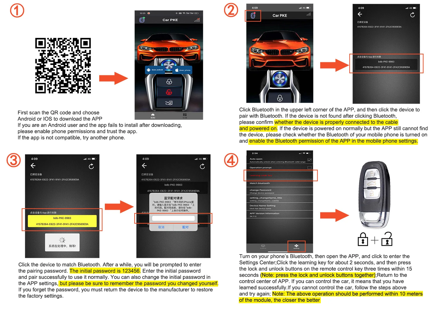 First, scan the QR code to download the app. After installation, open the app, tap the Bluetooth icon in the top left corner, then tap Bluetooth pairing. Enter the default password 123456. Once pairing is complete, return to the main screen, tap the settings icon in the top right corner, then tap Match Remote. Press the lock and unlock buttons on the remote simultaneously to complete the pairing.
