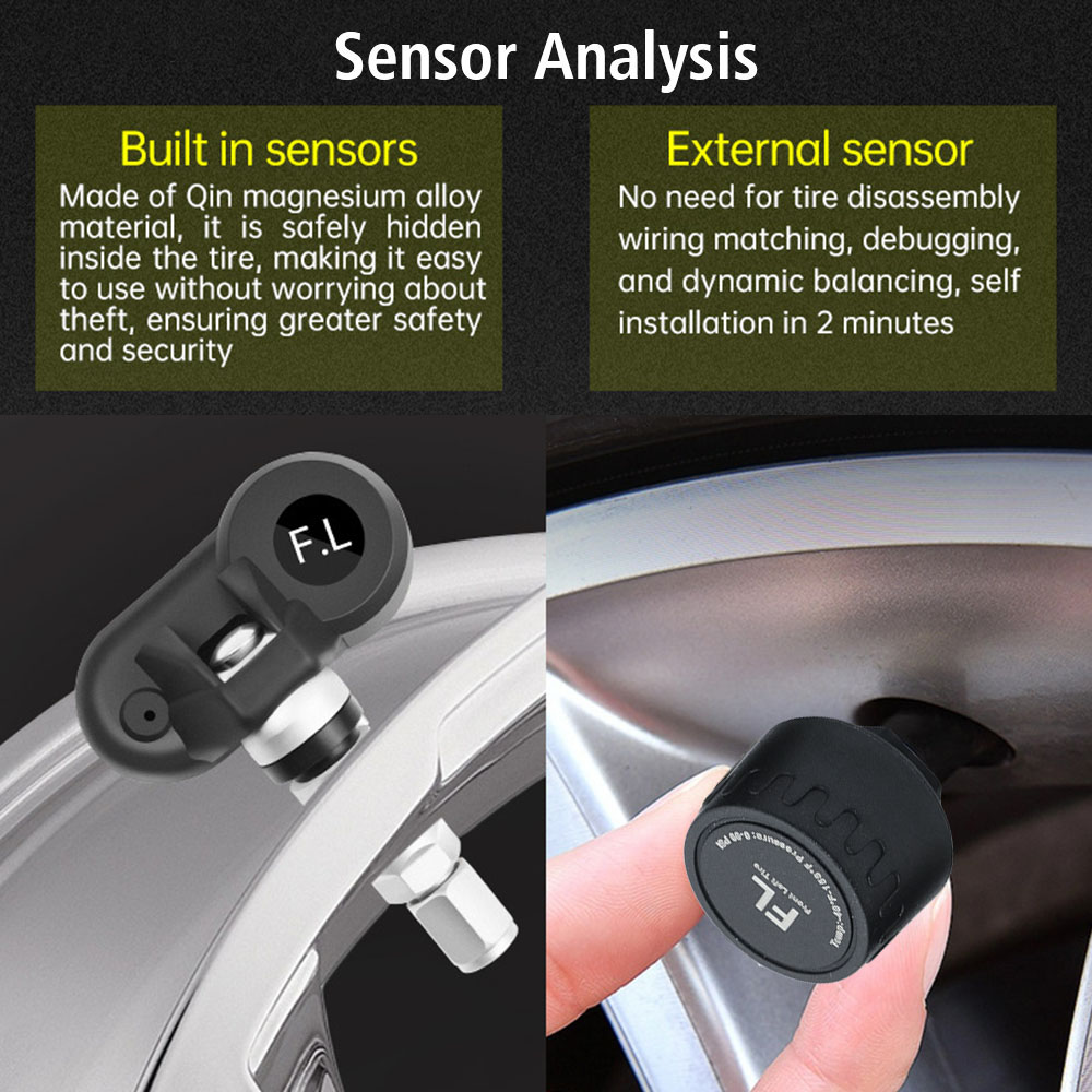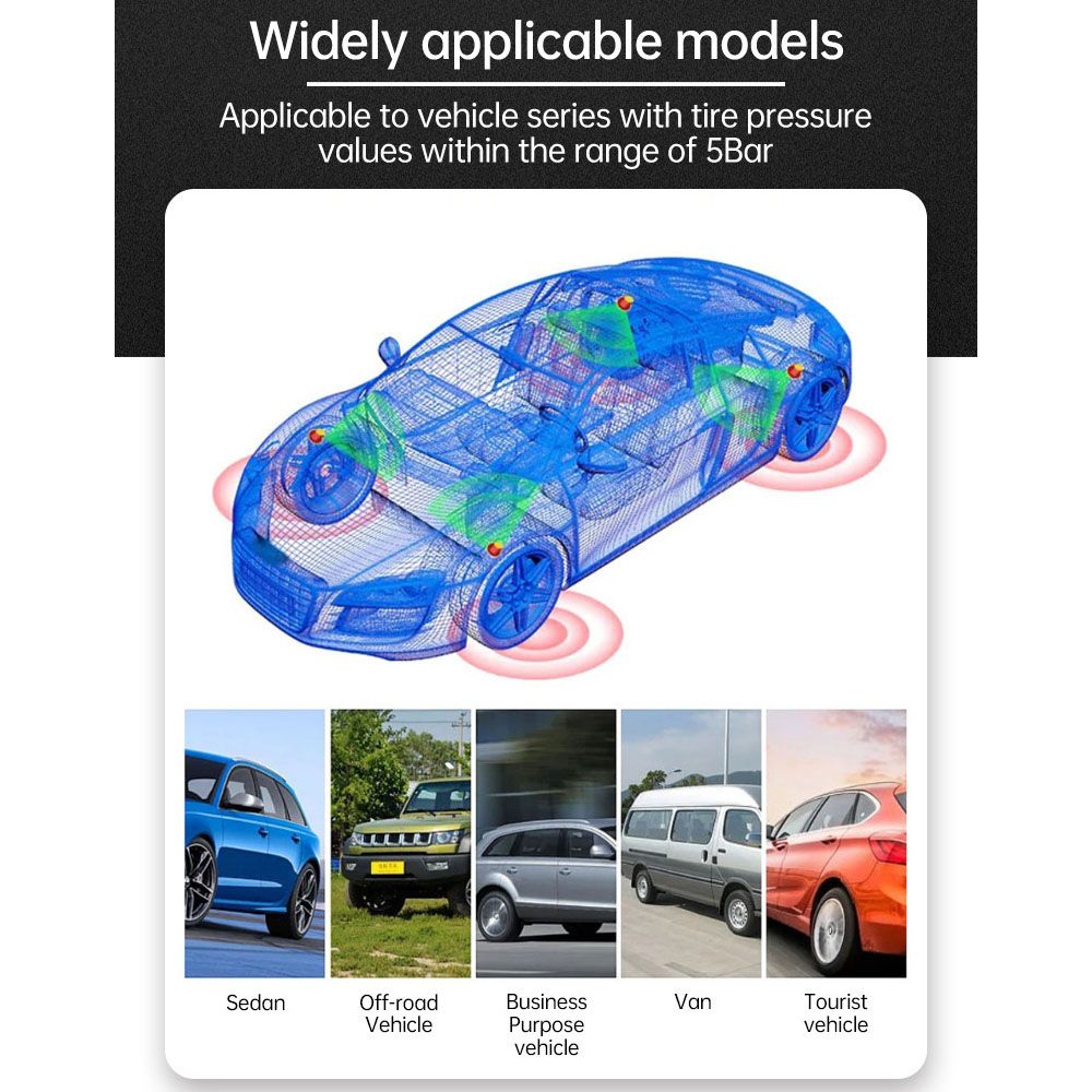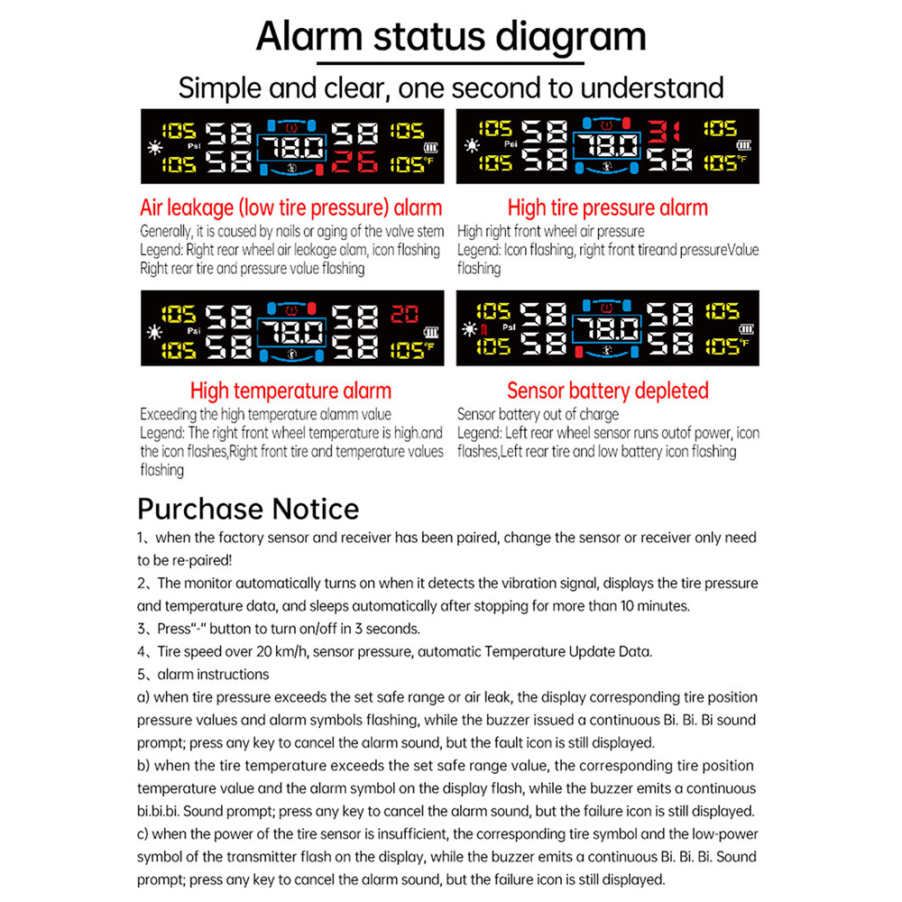 • Real-time automatic monitoring and warning of information, such as low tire pressure, high tire pressure, rapid air leak, high tire temperature and low battery voltage.