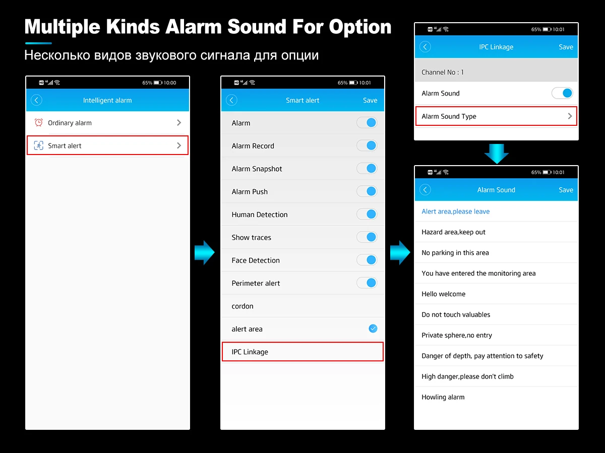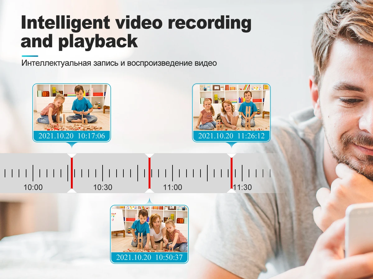 When someone breaks into shooting area, the camera will make alarm sound and alarm messages will be pushed to your Phone APP.