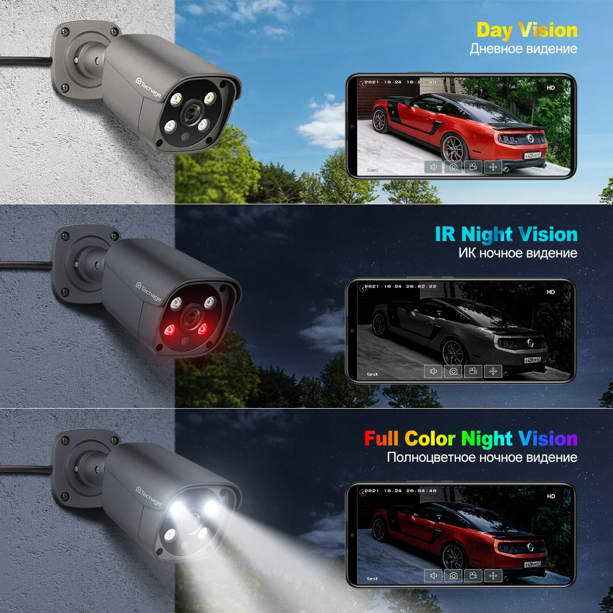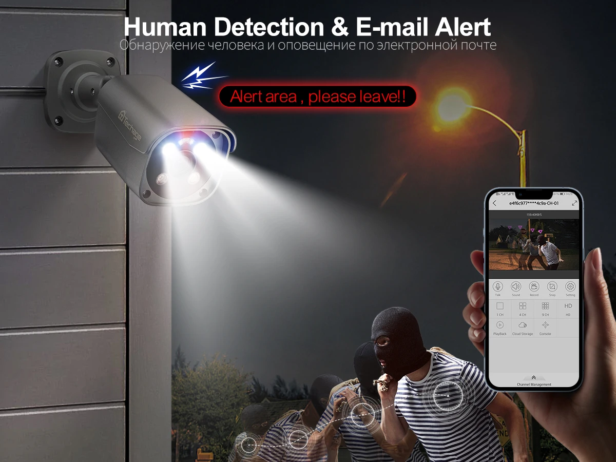 When camera detects a moving human body, hthe red and blue lights will flash alternately to scare off intruders at day or night.