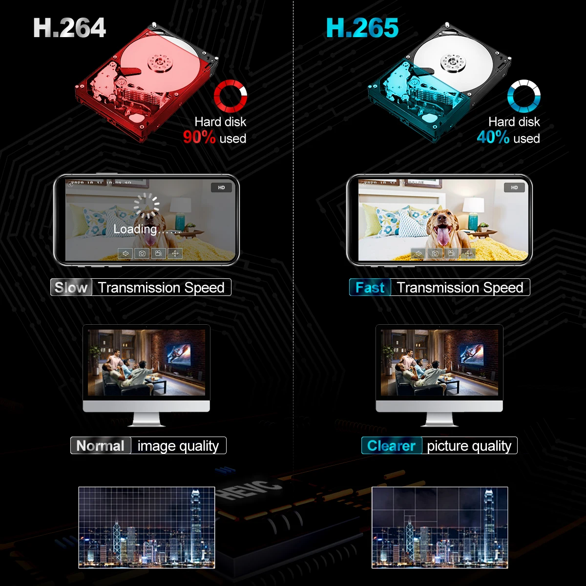 H.265 More Clear , HD resolution offer you best image quality in a lower bit rate.