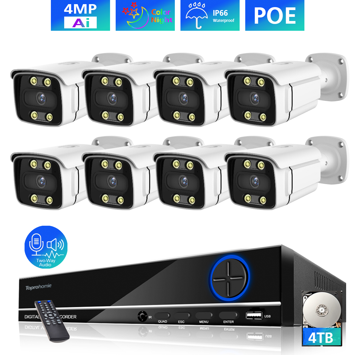 4 / 6 / 8 x 4Megapixel POE Outdoor/Indoor Two Way Audio & Colorful Night IP Cameras