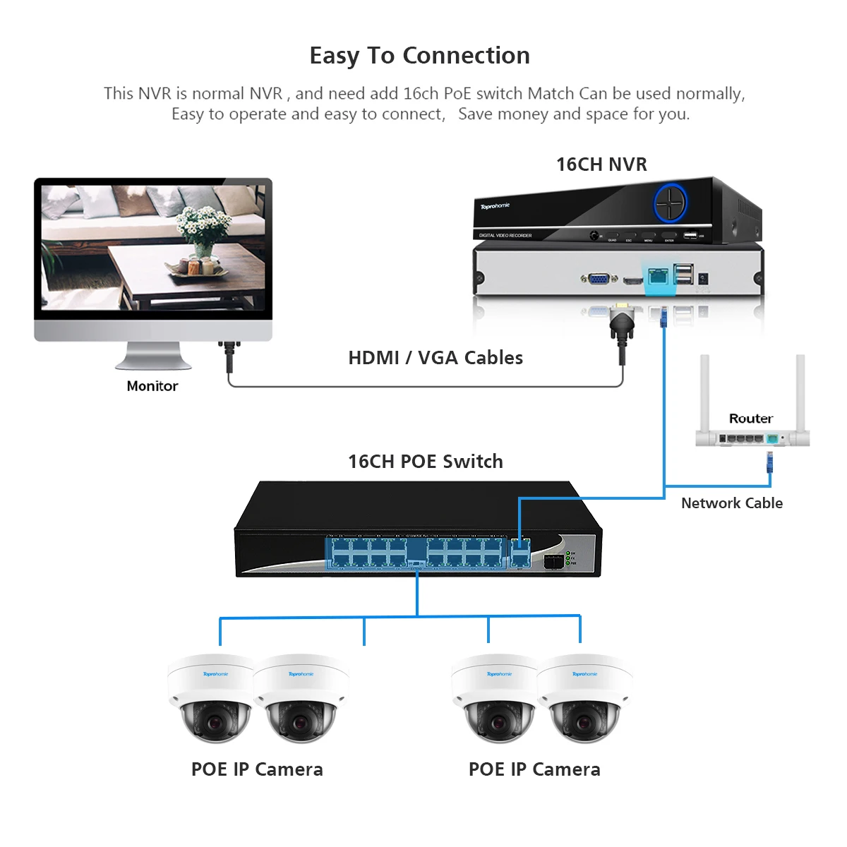 This NVR is normal NVR and Need add 16ch POE Swith Match can be used normally, Easy to operate and easy to connection