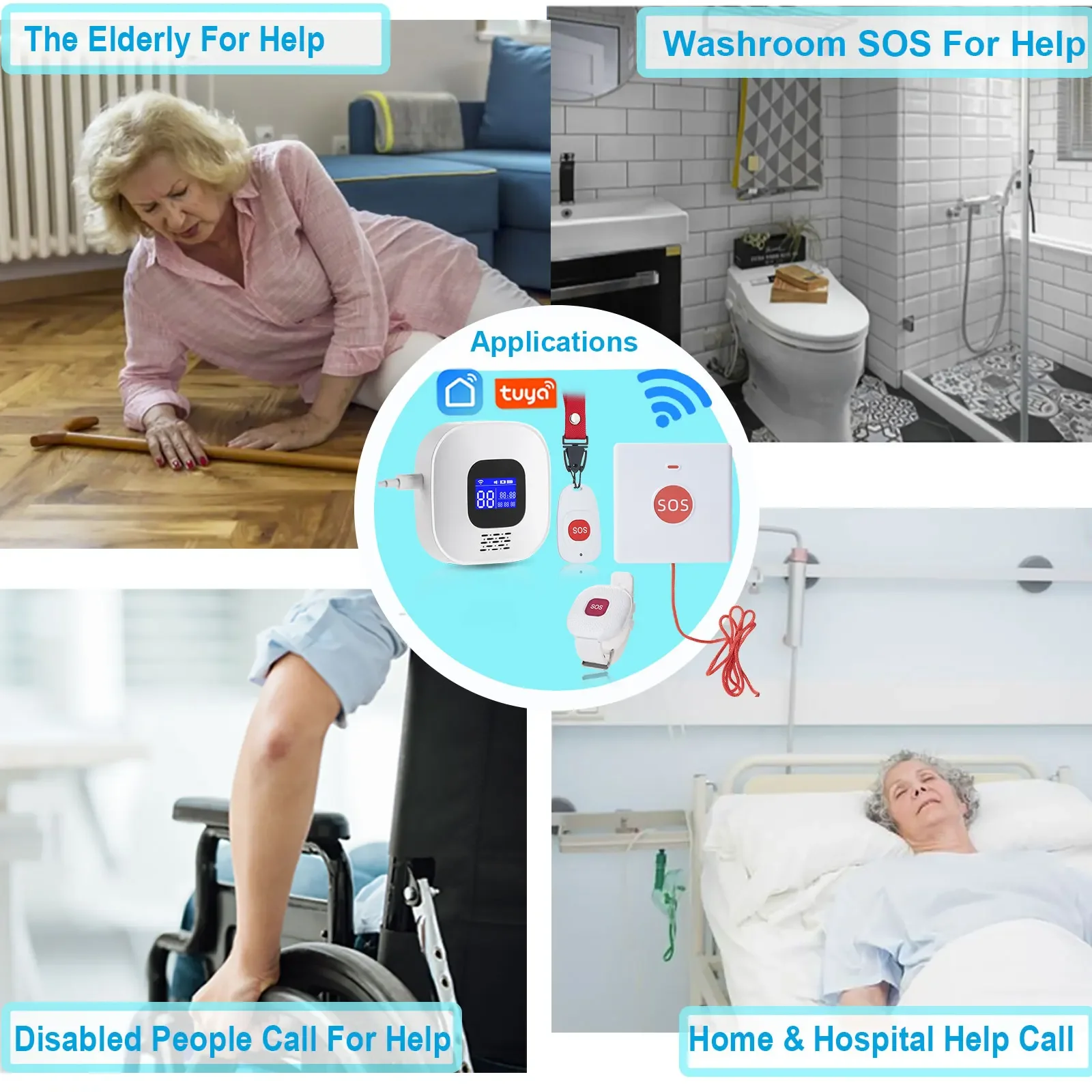 – Press SOS, SOS send signal to WIFI host, WIFI host send notification to APP, also with local alarm voice