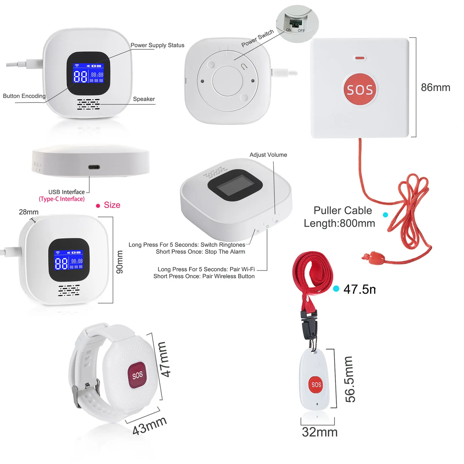 – Technical Parameters: SOS Bracelet (433Mhz, EV1527, 330K), WIFI host (connect 433mhz sensors, connect 2.4G WIFI)