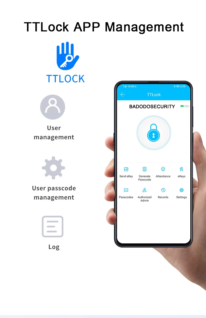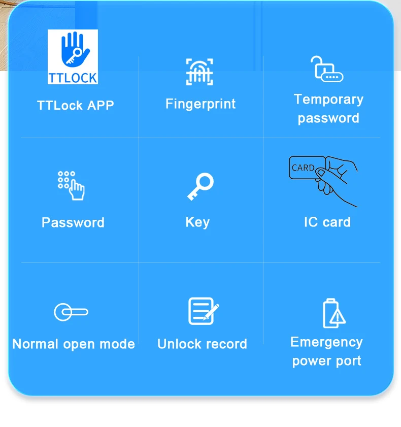 Unlock mode: Fingerprint / Password/ IC Card/ Mechanical Key (2pcs) / TTLock APP (Bluetooth)