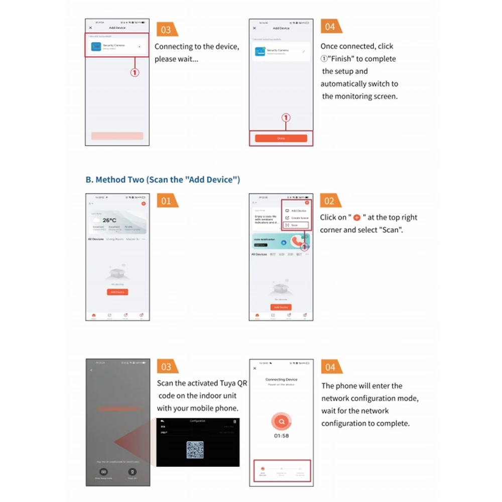 After downloading the Tuya app, Just scan the QR code to connect to the app,you can connect the monitoring device to your smartphone in less than two minutes.The operation is simple and safe.
