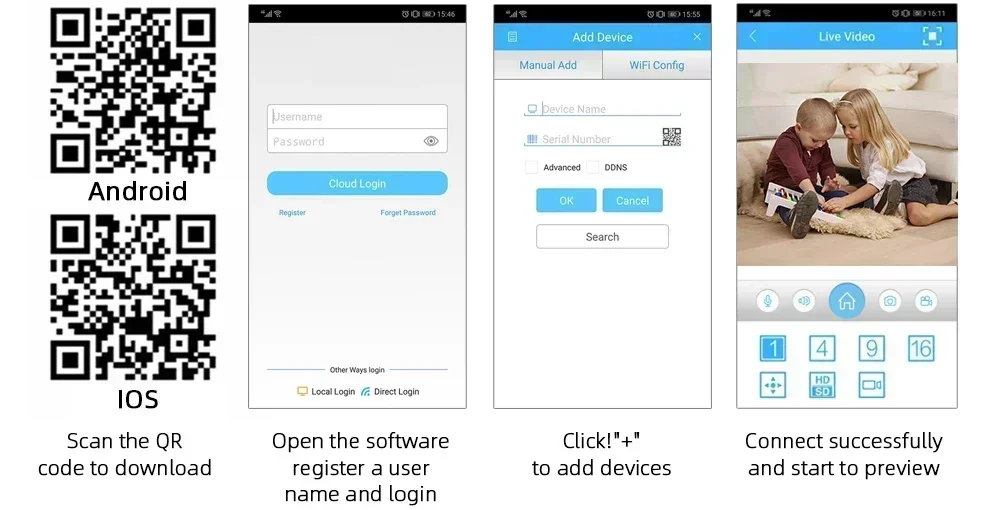 Based On P2P (Peer To Peer) Technology, Support Plug-And-Play Installation.Access The IP Camera Through Its Web Interface Via Internet Explorer,Also Comes With a Free Smartphone App (Android & Iphone) For Remotely View From Anywhere.Support IOS And Android Device Access. Scan QR-Code To Login. Download Free App In Apple App Store / Google Play.