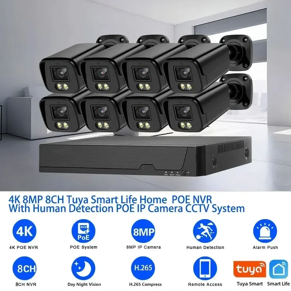 TUYA 4K 8MP POE IP Camera Security System 8CH NVR Kit with Outdoor Waterproof Audio CCTV Camera Video Surveillance Home Business