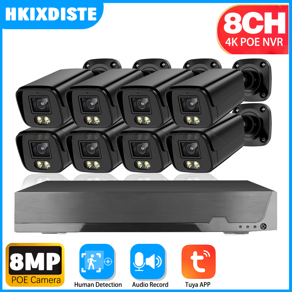 Tuya 4K POE IP Camera Security System Set 8MP 8CH NVR Kit Outdoor Waterproof Audio CCTV Video Surveillance Camera System Kit 4CH