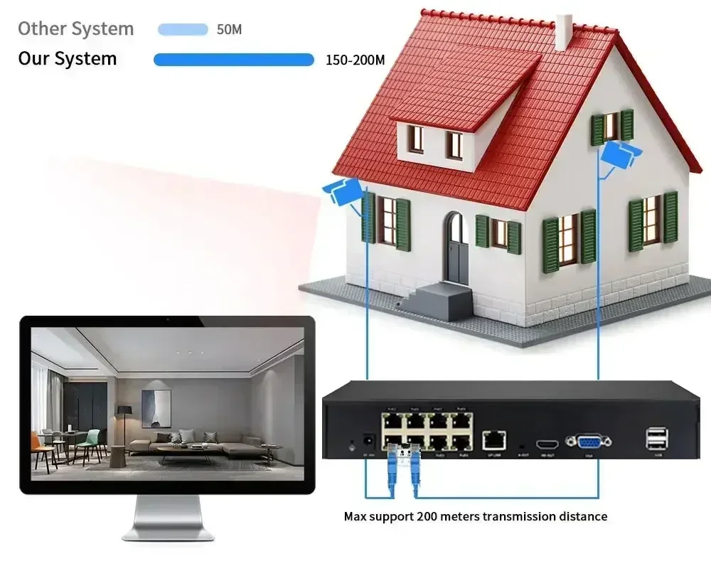 POE System max support 150M-200M POE cables transmission distance, which greatly increases home installation convenience.