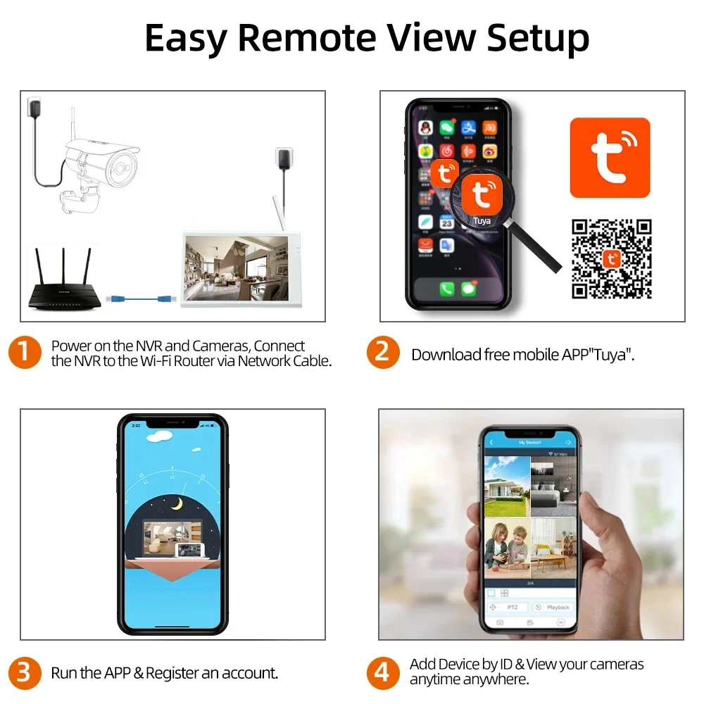 Easy setting , just 4 steps for mobile phone viewing,View live video of the system from anywhere and anytime via you smart phone, table or PC with advanced P2P technology, you are able to remote access your system in minutes or less, no portforwarding needed, remote access has never been so easy!!!