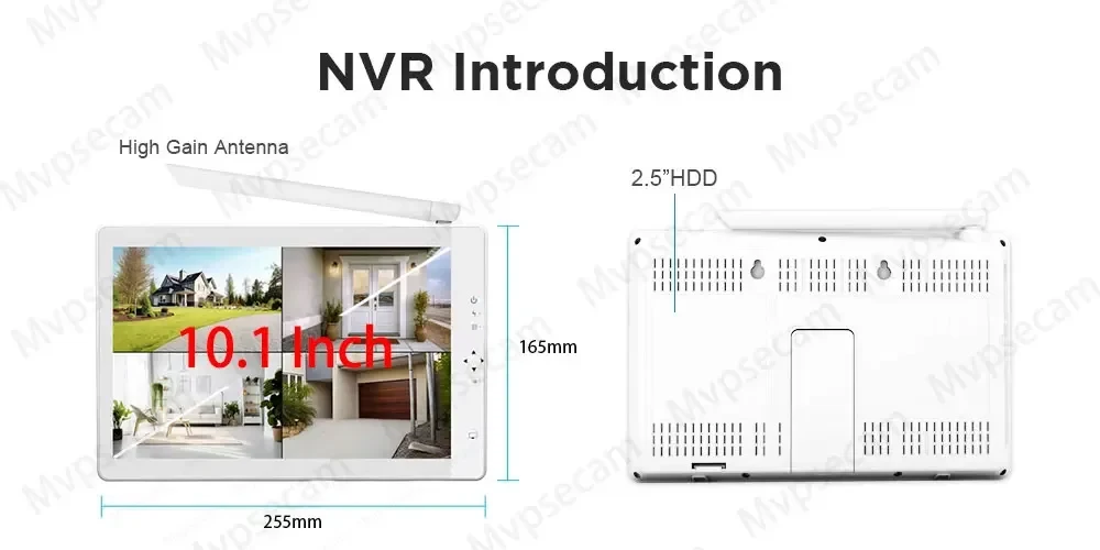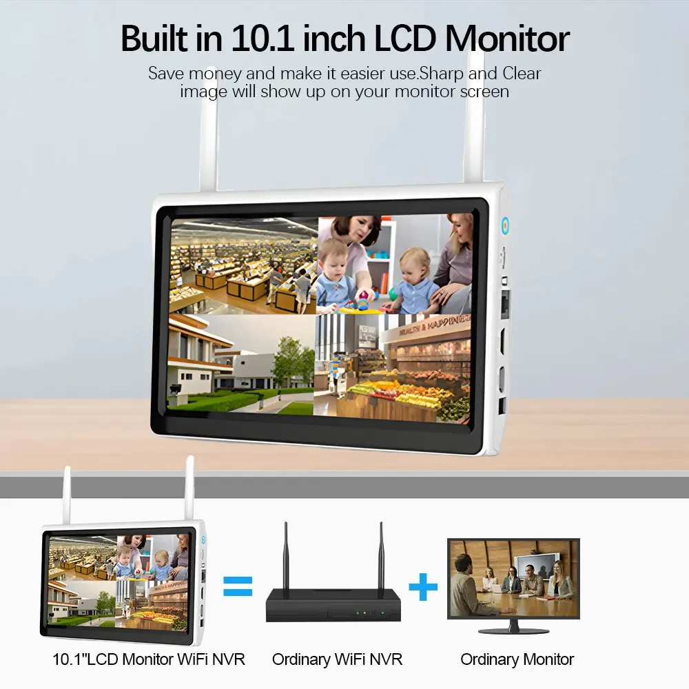 This wireless security camera system with 10.1 inch monitor, you can have a high definition image during the real time monitoring, you don’t have to buy a seperate screen, save more money, and more space. You just need power on the camera and NVR, then the images will show on the screen for you. The really plug and play. And you can view the 10 cameras at the same time on the screen.
