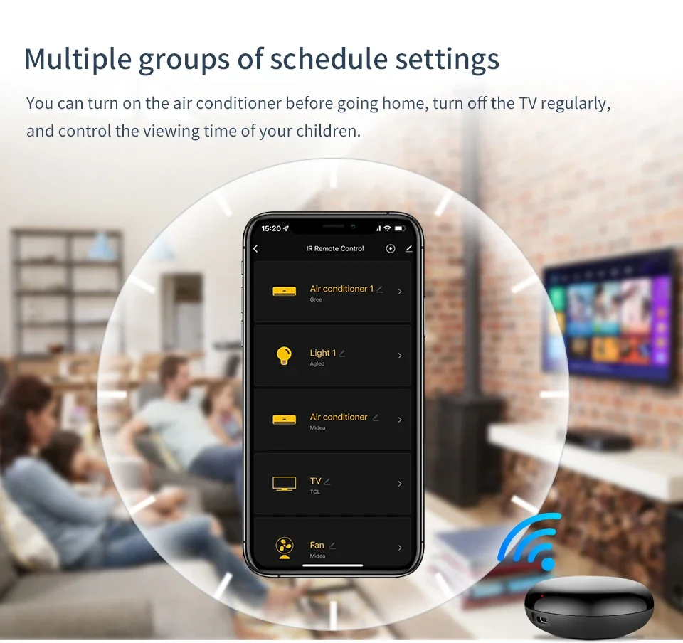 A scenario consists of 1 or more actions. By creating an “Scenario”, you may control multiple devices with one tap; By adding an “Automation” and interworking with other smart home devices, Wi-Fi remote control is able to execute actions automatically according to conditions, such as device status, weather and time.
