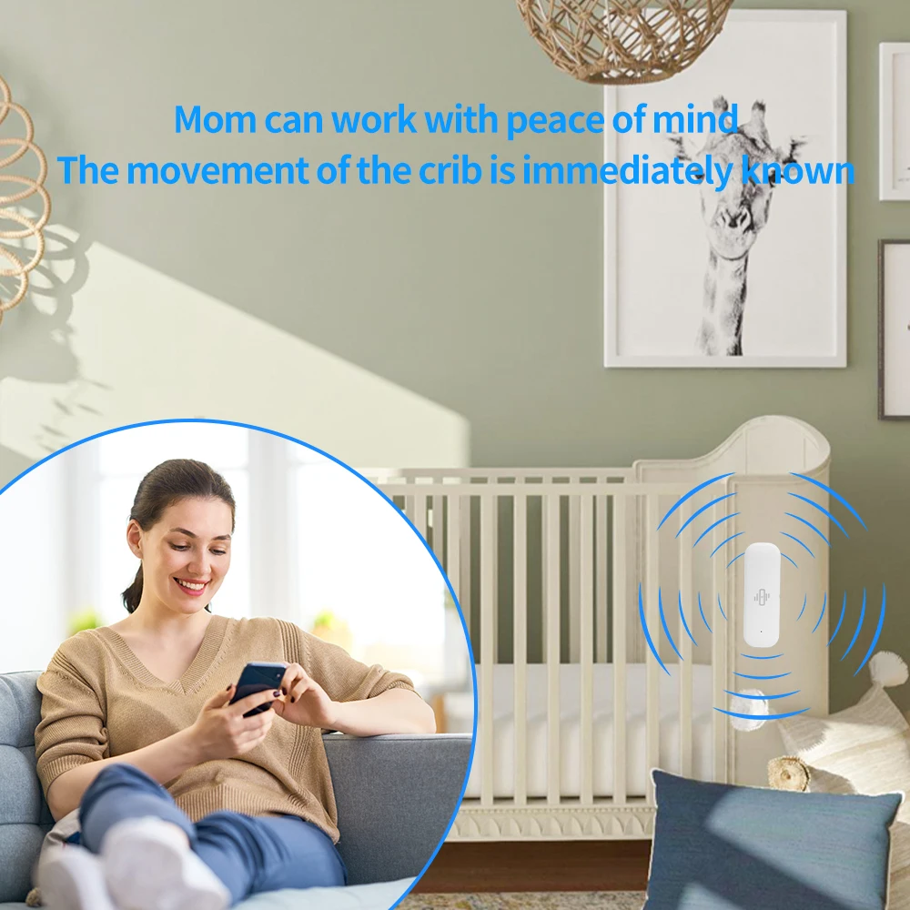 4.Applicable scenario: You can place the sensor on the baby cot, and when the cot moves, you can receive a notification on your phone, allowing you to work at home with peace of mind.