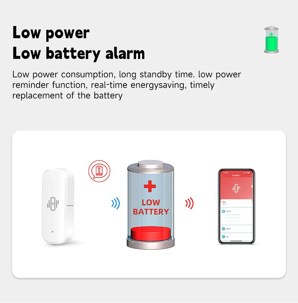 6.Low battery alert: When the sensor's battery is insufficient, you can receive notifications through the mobile app, so you don't have to worry about battery issues.