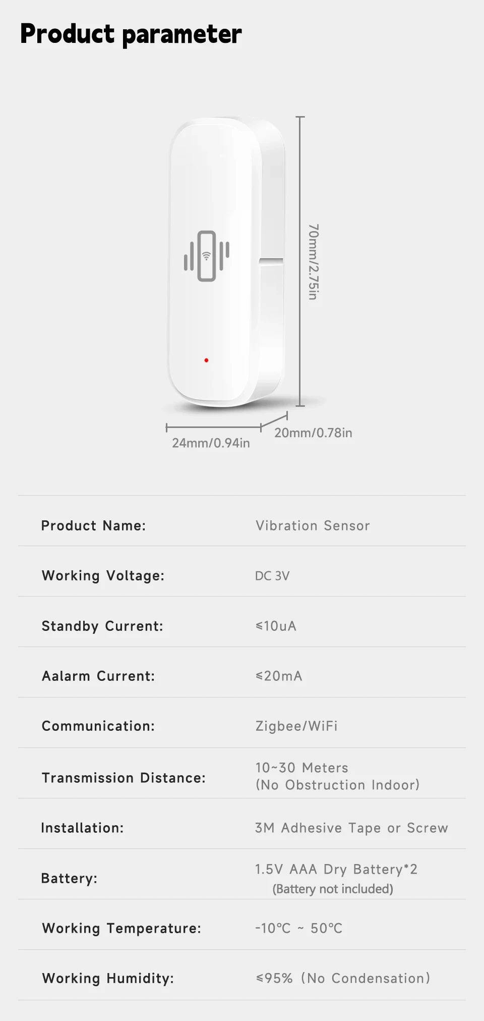 1.High sensitivity:The sensor has 10 adjustable sensitivity levels, capable of detecting even a pin dropping to the ground, making it suitable for various scenarios.