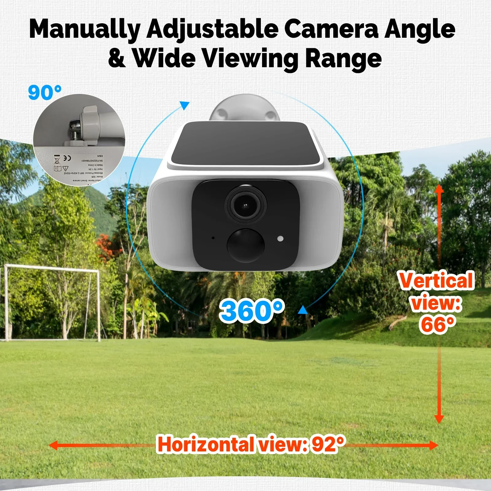 Designed for fixed positions, the camera supports manual angle adjustment within 360° horizontal and 90° vertical rotation.