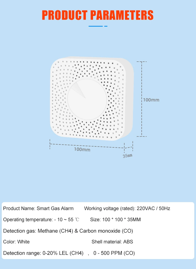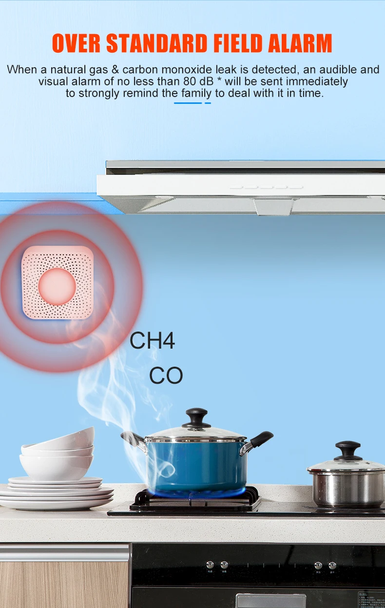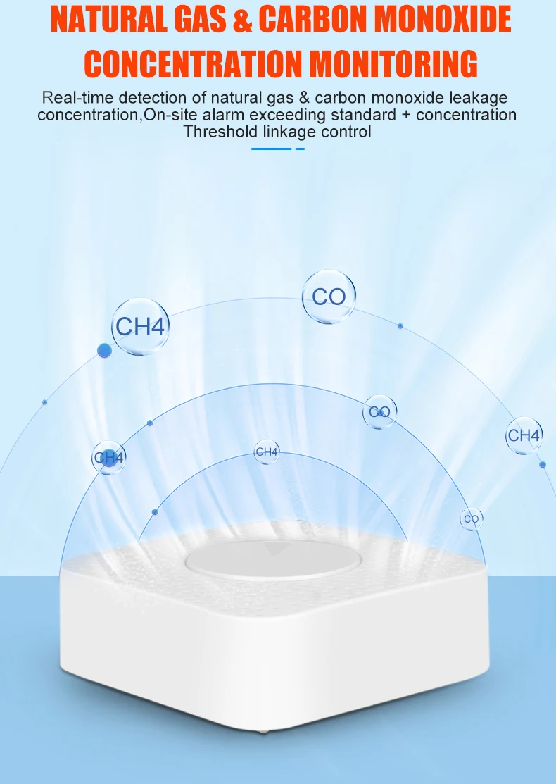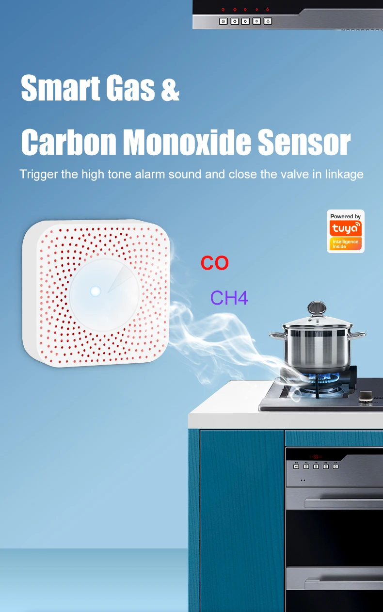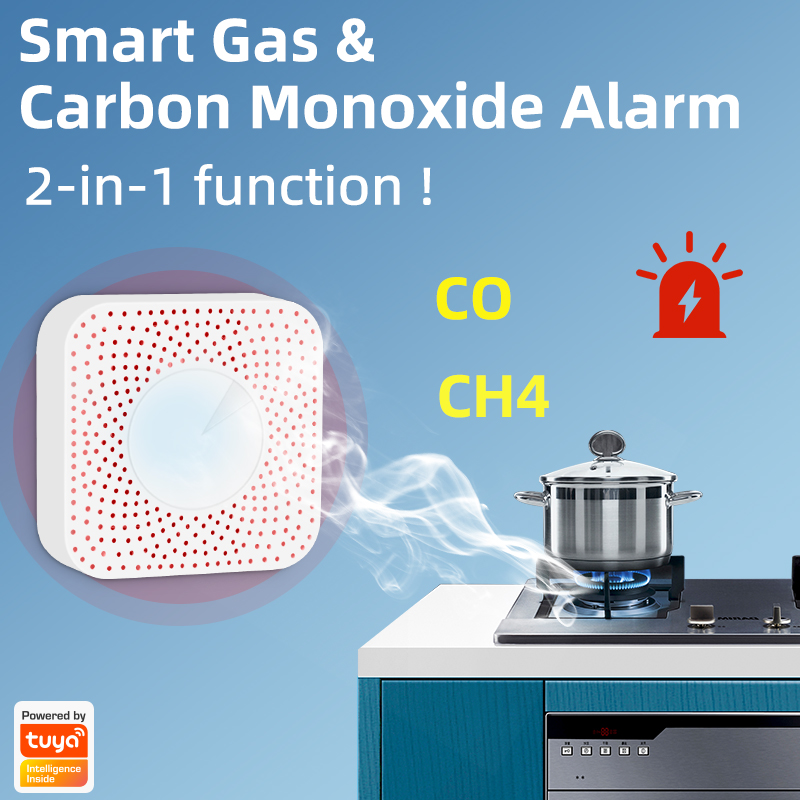The gas & carbon monoxide alarm box is a two-in-one smart device that detects the concentration of kitchen gas and carbon monoxide in real time. The gas concentration value can be viewed in real time through the Tuya APP. If the concentration exceeds the standard, an 80-decibel high-pitched alarm will be triggered, and the Tuya smart gas valve will be closed at the same time and an alarm message will be sent to the user.