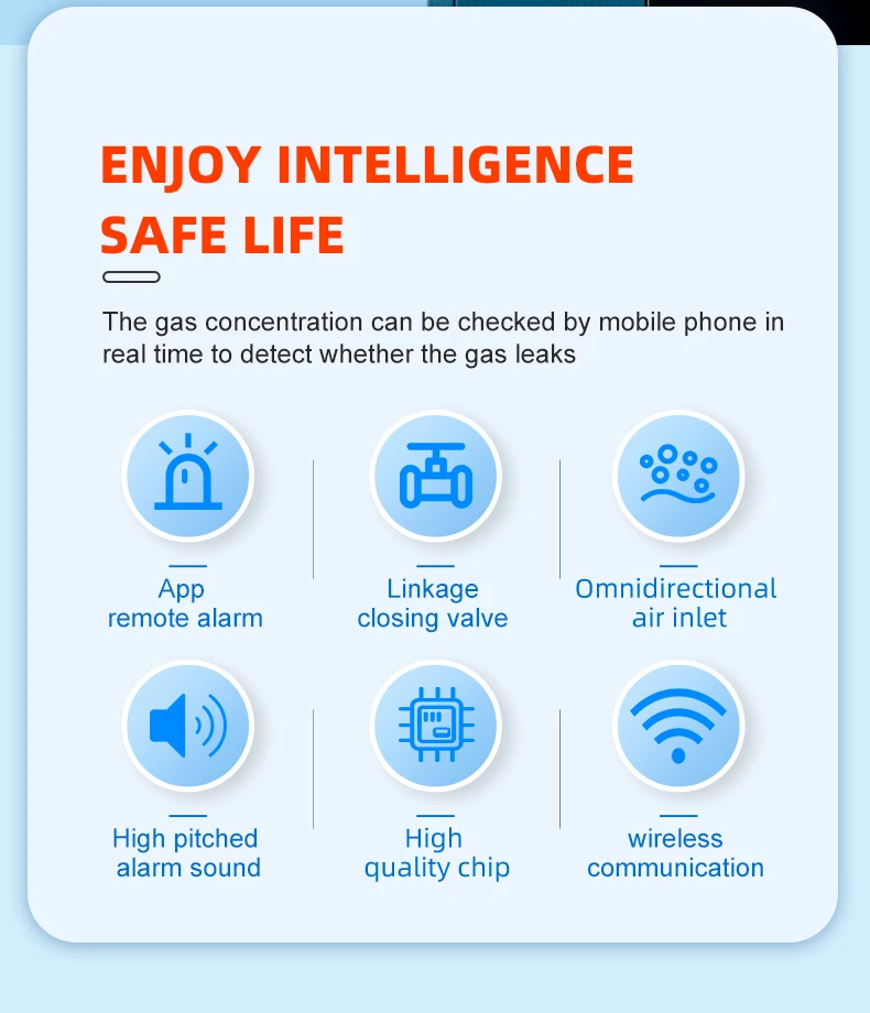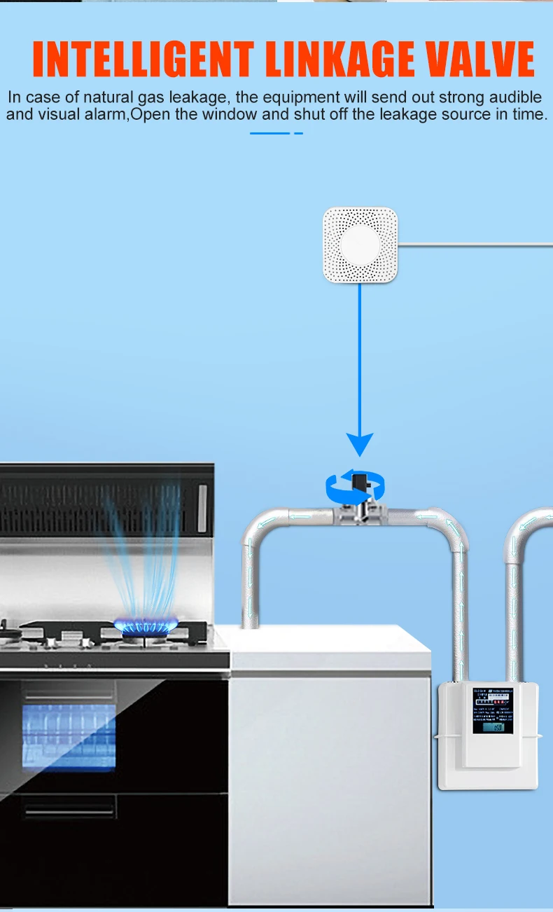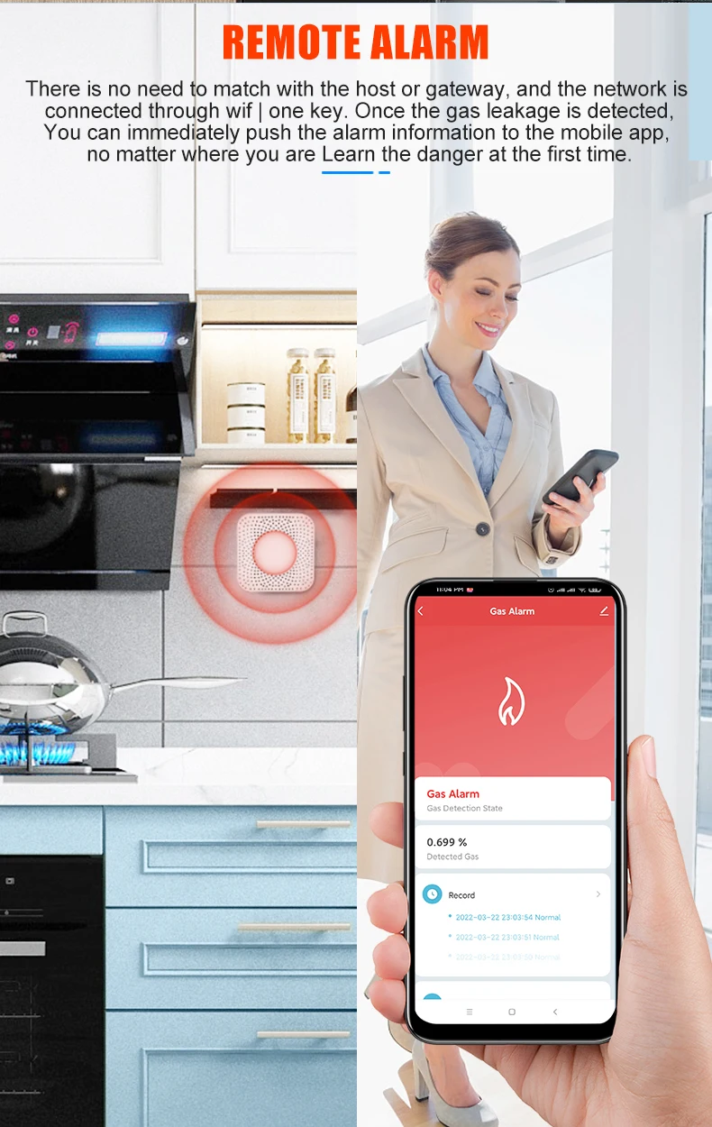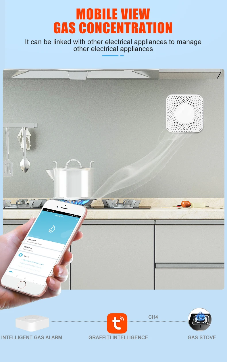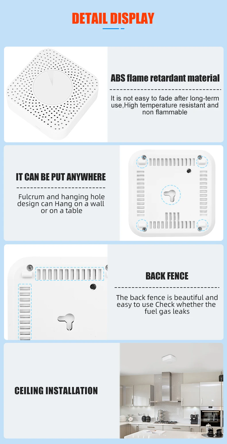 The gas & carbon monoxide alarm box is a two-in-one smart device that detects the concentration of kitchen gas and carbon monoxide in real time. The gas concentration value can be viewed in real time through the Tuya APP. If the concentration exceeds the standard, an 80-decibel high-pitched alarm will be triggered, and the Tuya smart gas valve will be closed at the same time and an alarm message will be sent to the user.