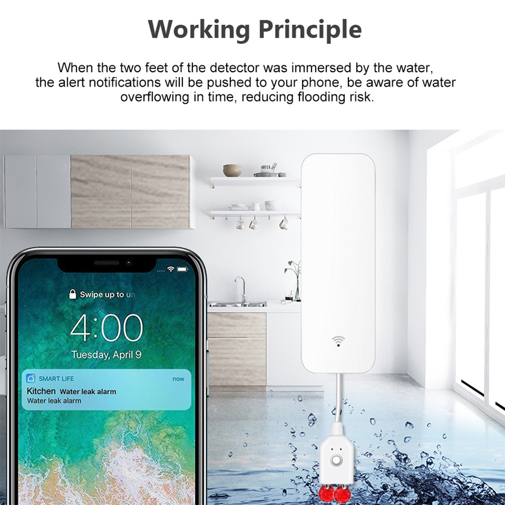 When the two feet of the detector was immersed by the water, the alert notifications will be pushed to your phone, be aware of water overflowing in time, reducing flooding risk.