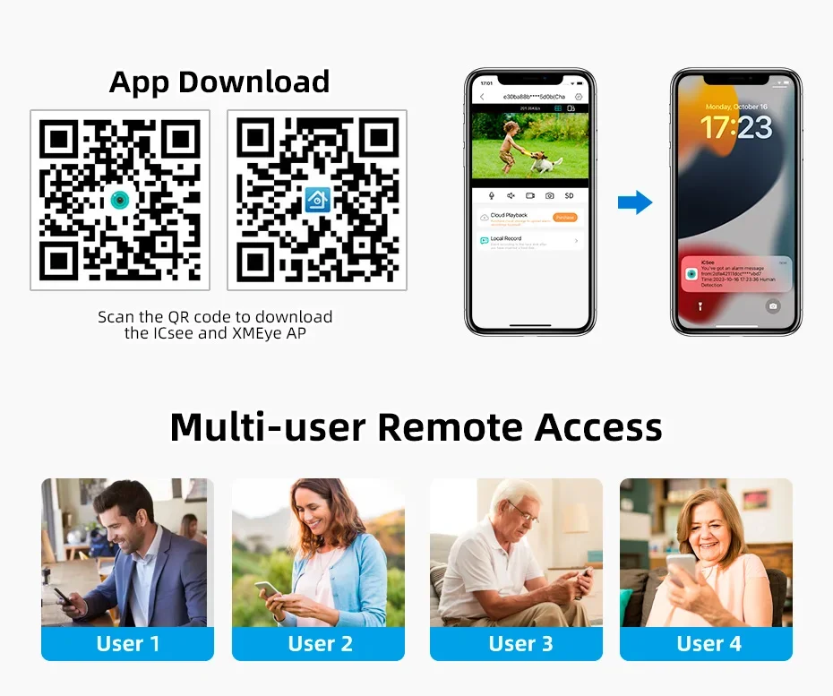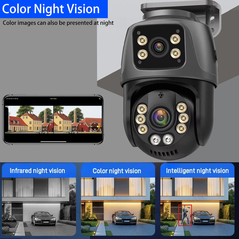 When someone breaks into shooting area, the camera will make alarm sound and alarm message will be pushed to your Phone APP. And when it motion detect, 4 white LED lights will light up, showing you the color night scene.
