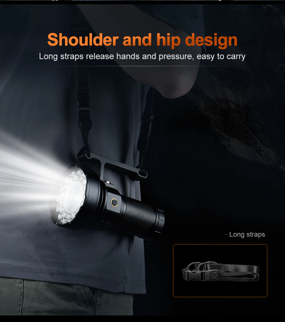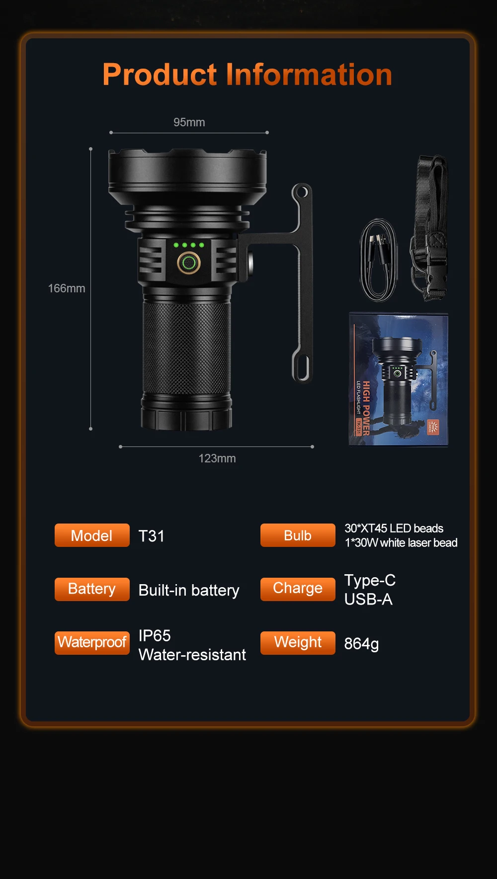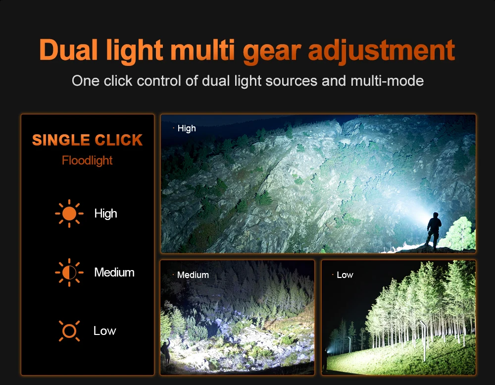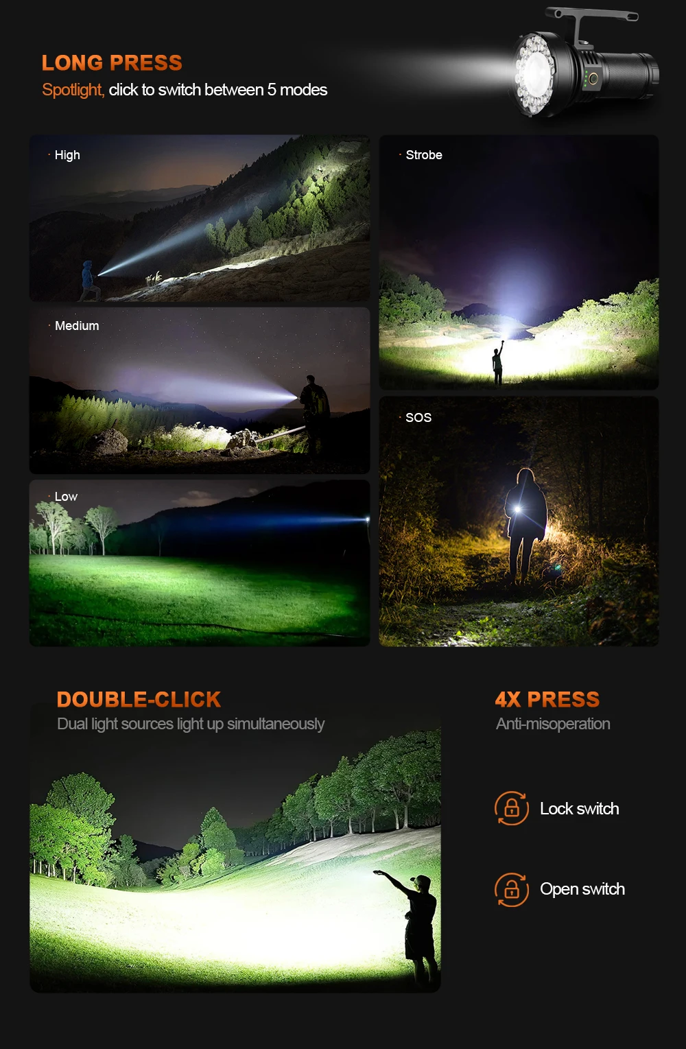 2.LONG PRESS(Spotlight):click to switch between 5 modes:High-Medium-Low-Strobe-SOS