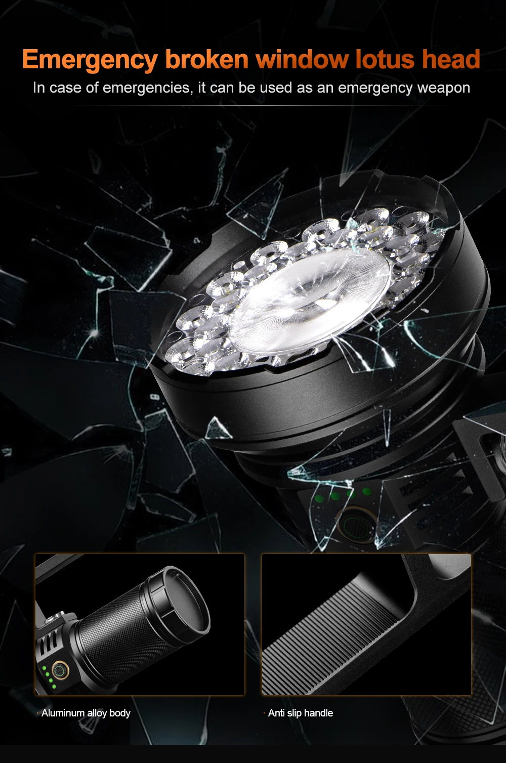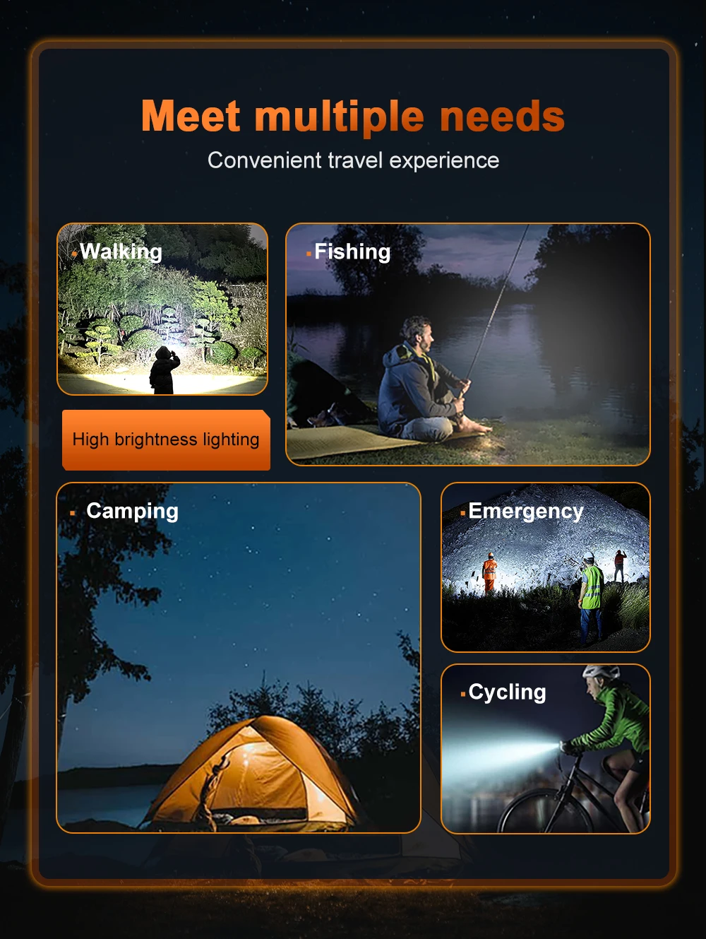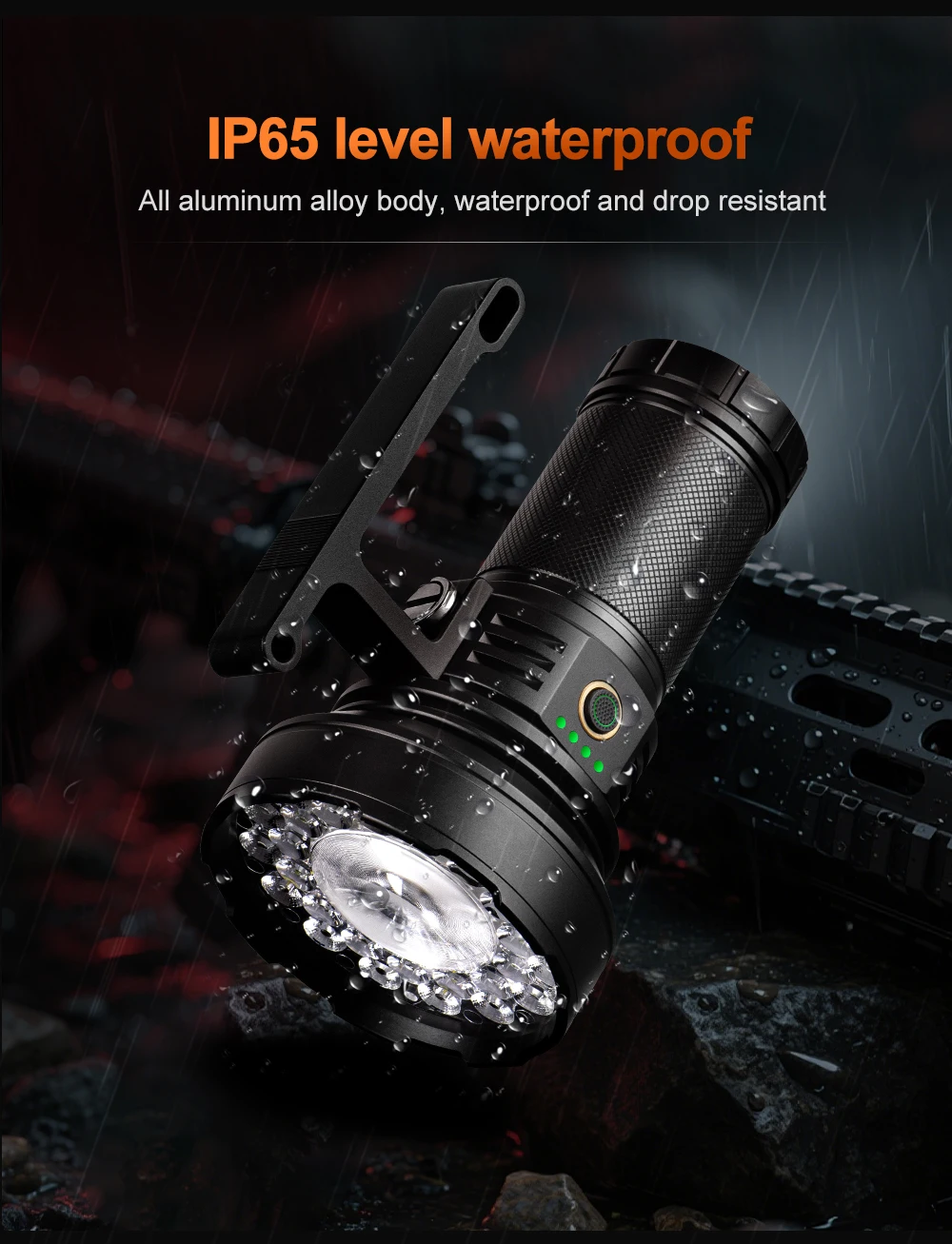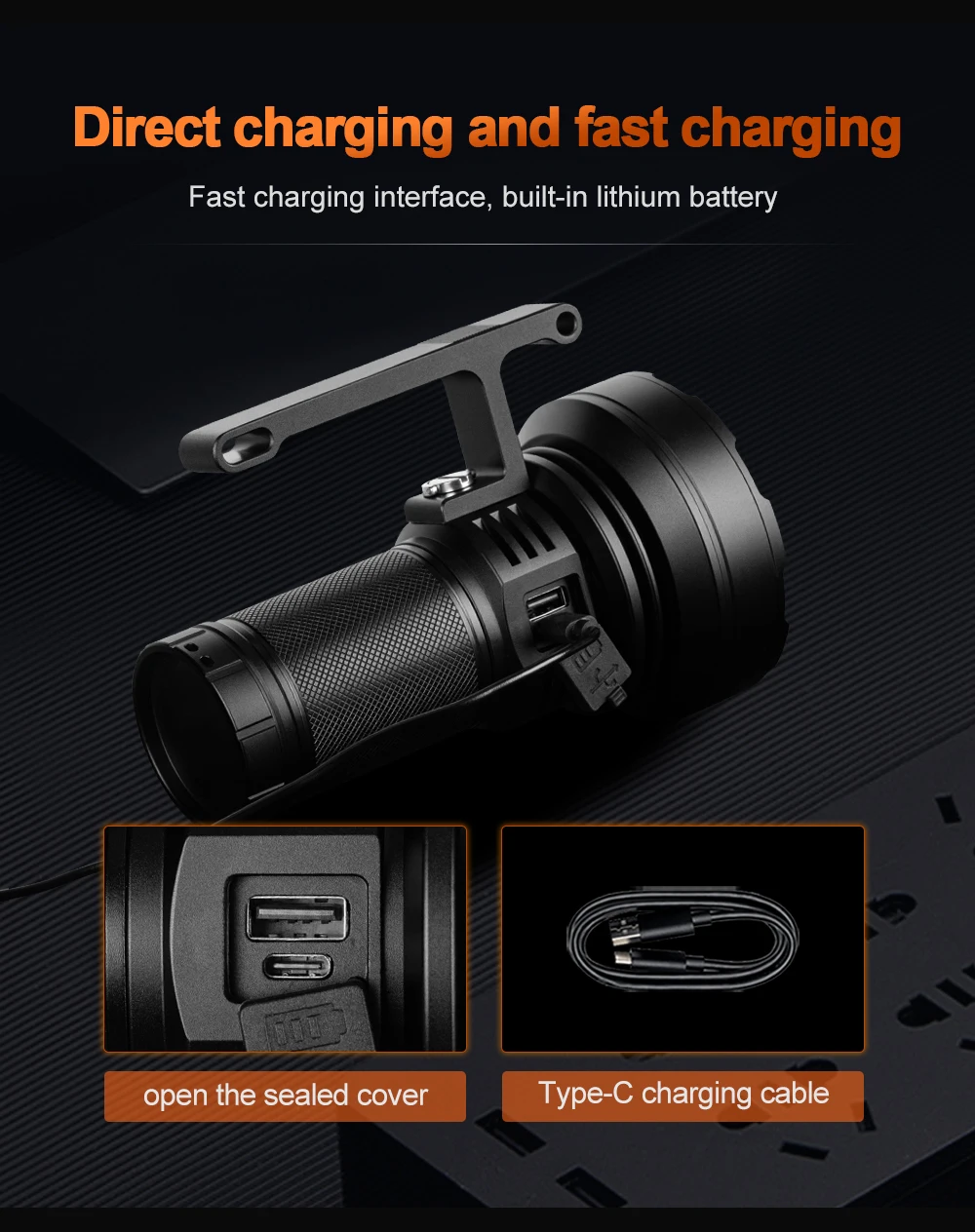 2.LONG PRESS(Spotlight):click to switch between 5 modes:High-Medium-Low-Strobe-SOS