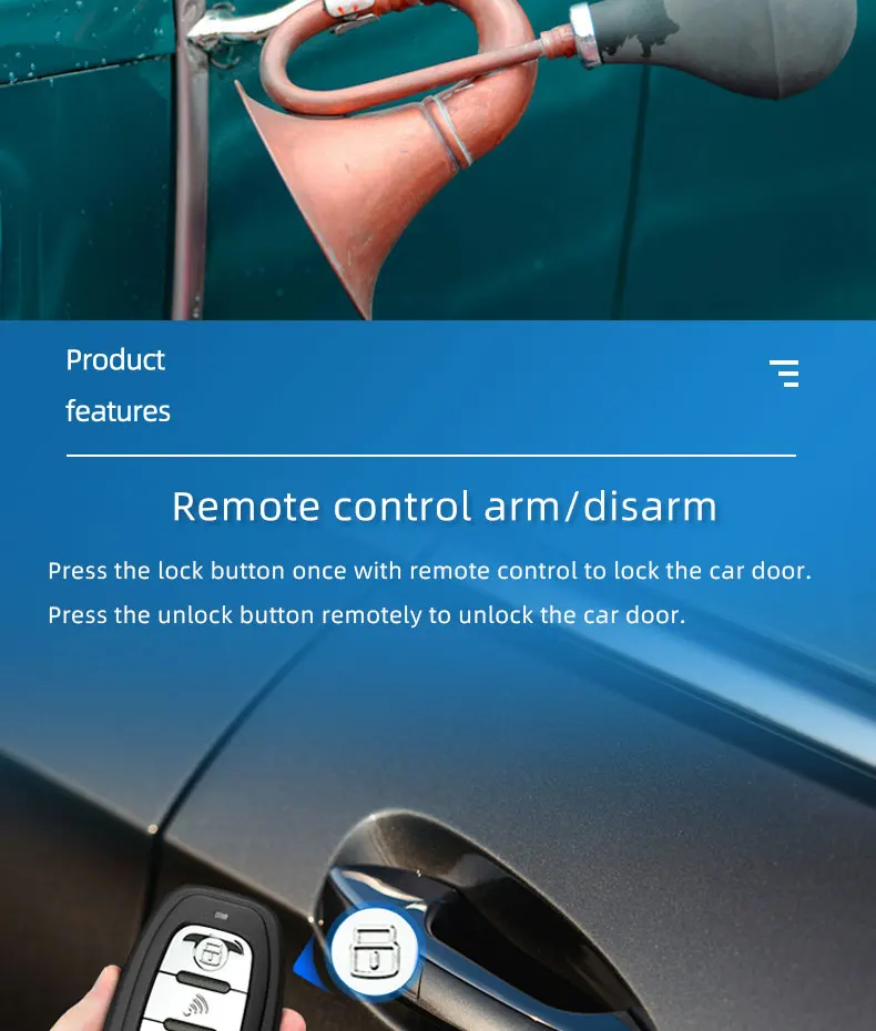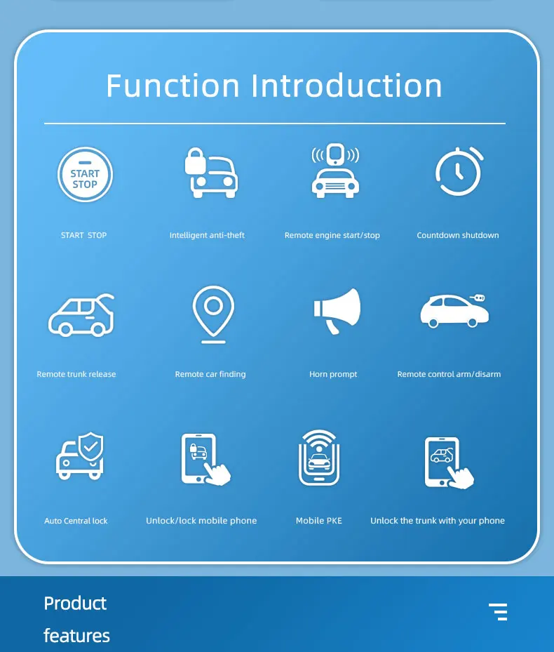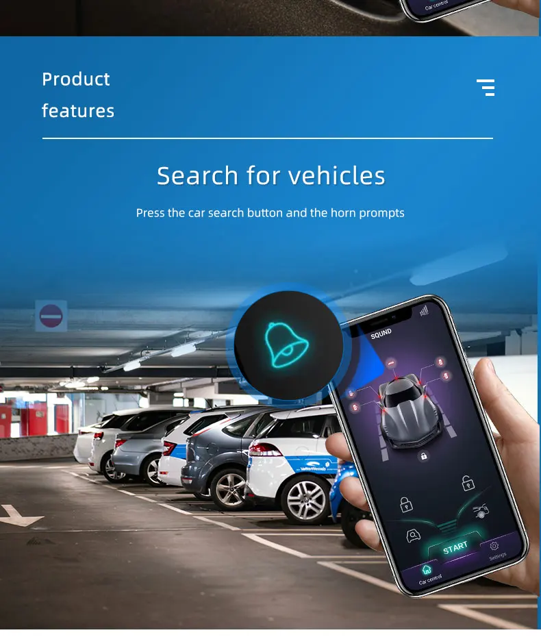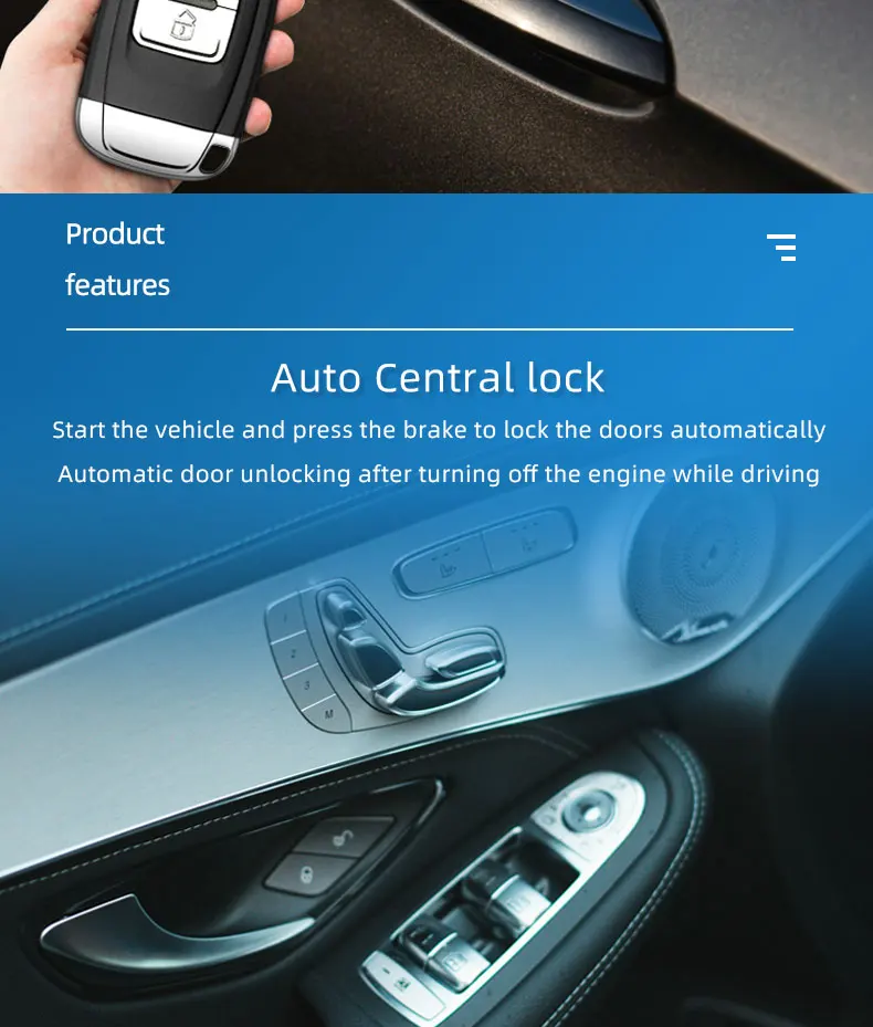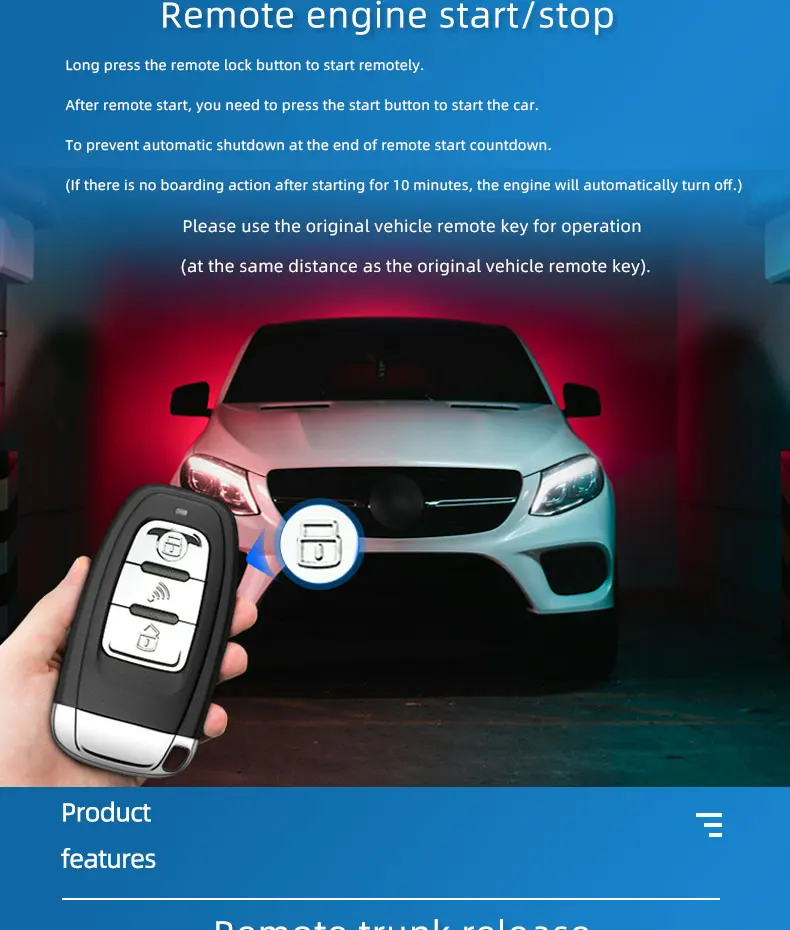 Support remote trunk unlocking, horn alert (mute available), automatic door lock/unlock, and 10-minute remote timed engine shutdown to meet daily use needs.
