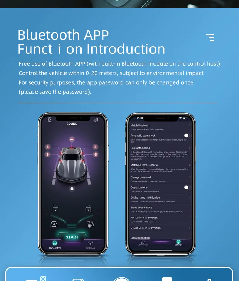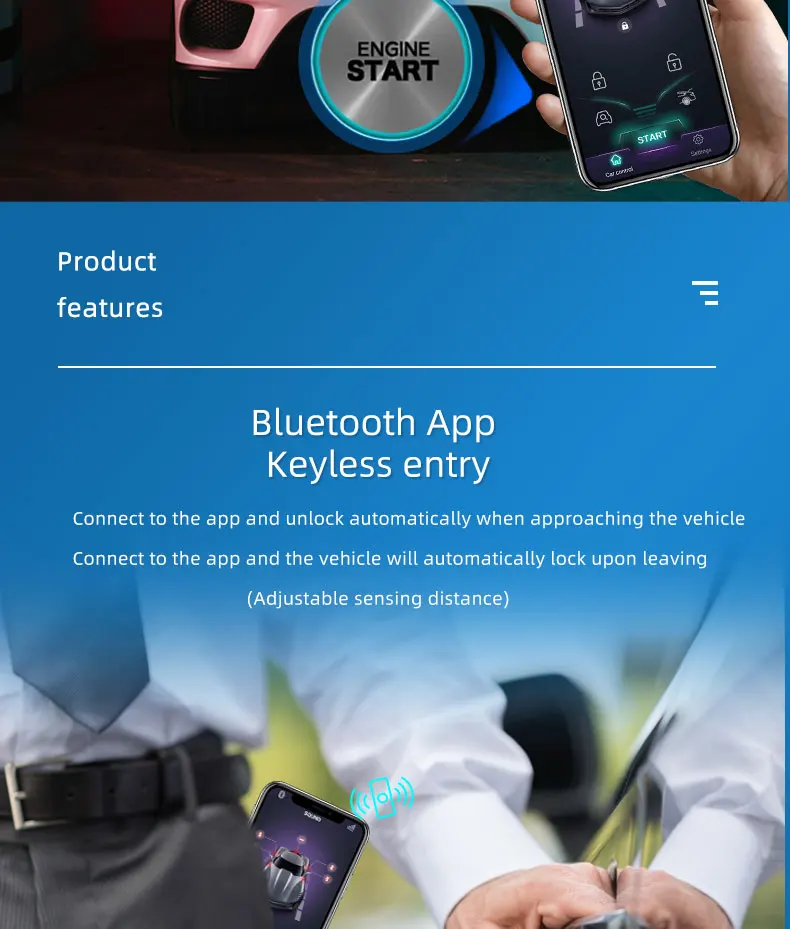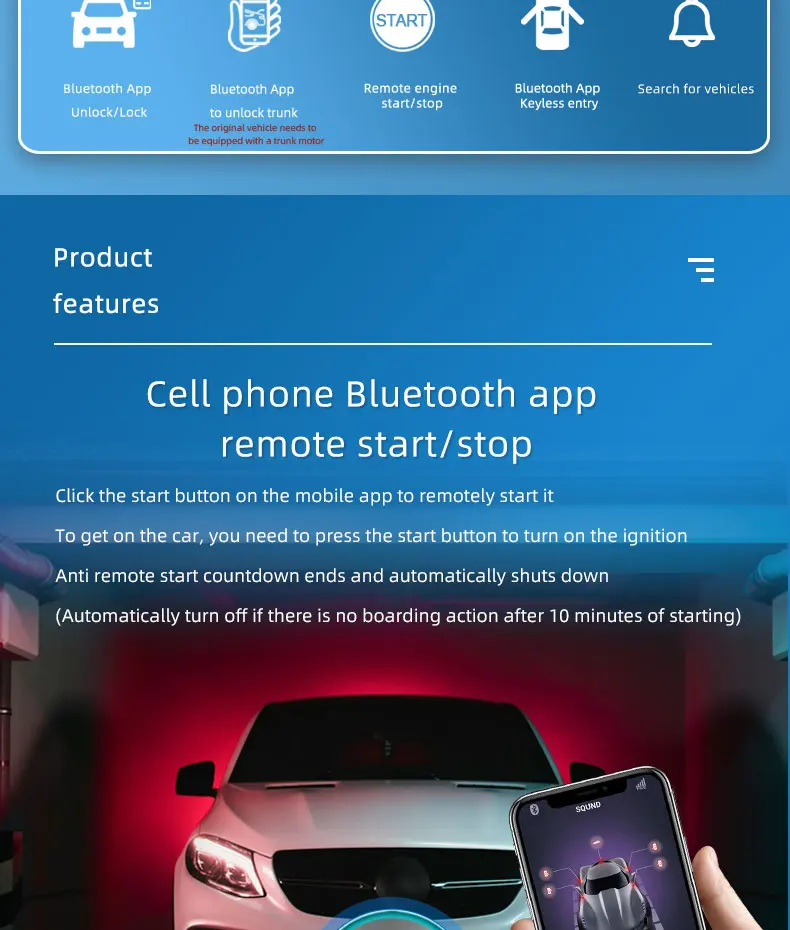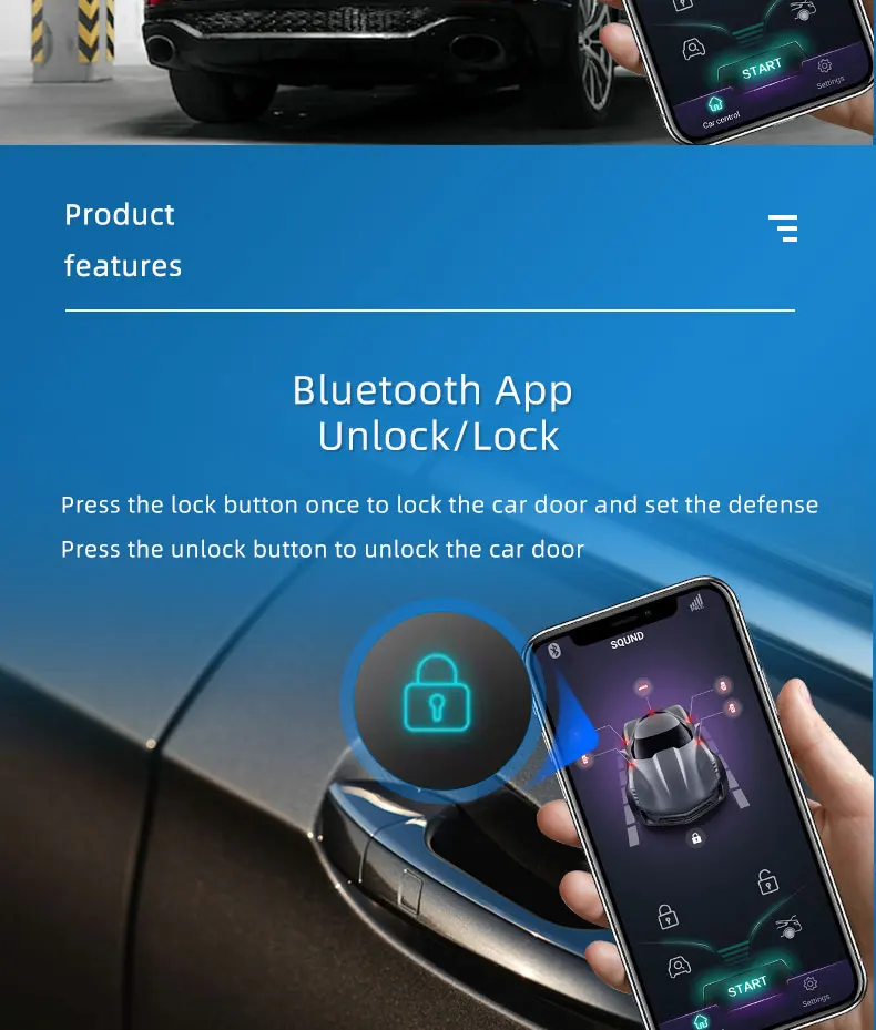 Equipped with Bluetooth keyless entry. The Bluetooth APP supports remote lock/unlock, trunk release, and remote engine start/stop. No additional remote key required; the APP acts as your remote control, and it works with your original car remote.