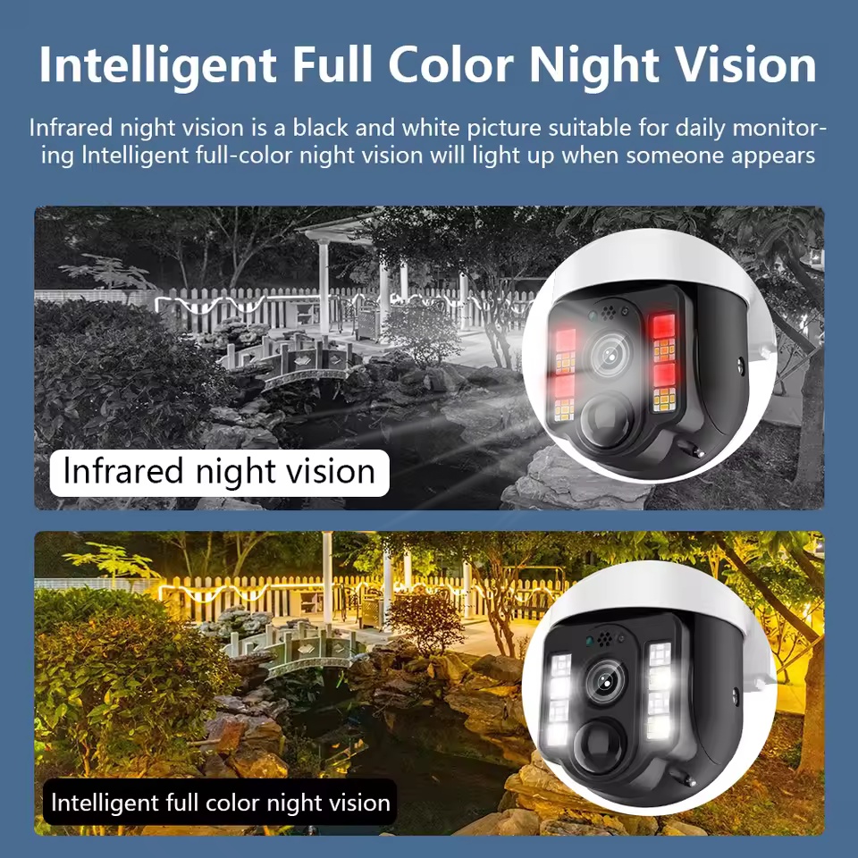 Intelligent full-color night vision, detect the shape of the human body and automatically turn on the lighting. Infrared night vision is a black and white image, suitable for daily monitoring. When someone appears, the intelligent full-color night vision device will light up