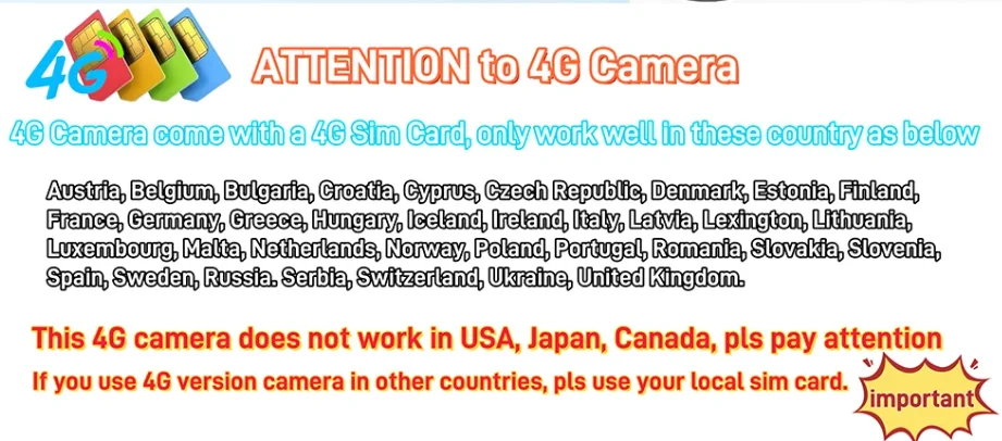 This 4G version camera work well in the most of countries ( But not work in USA, Chile, Iran, Japan )
