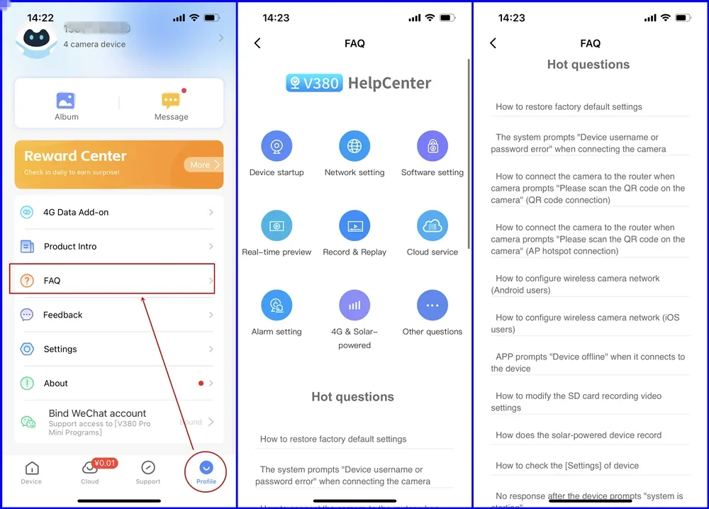 If you have any questions about the device. You can find out more answer in the “FAQ” in the setting of V380 pro app.