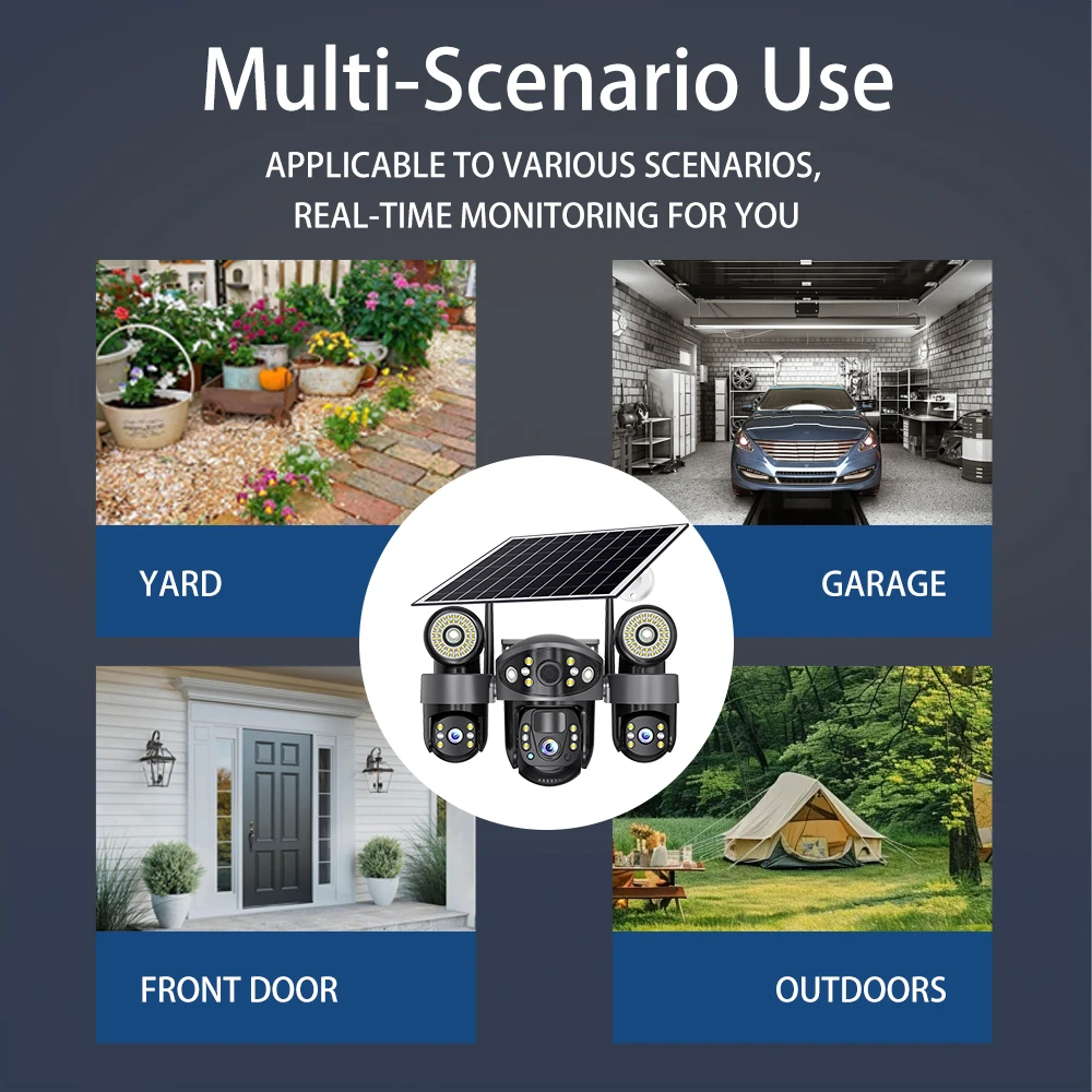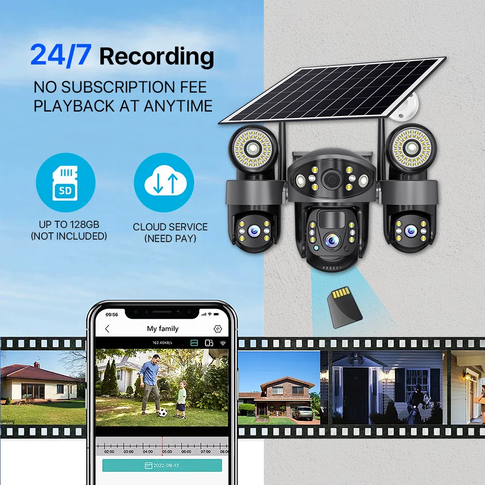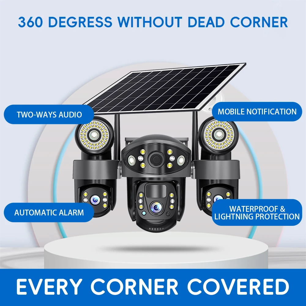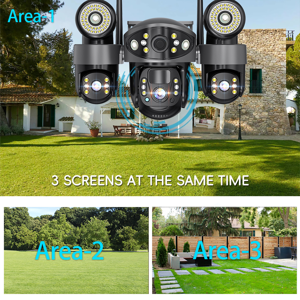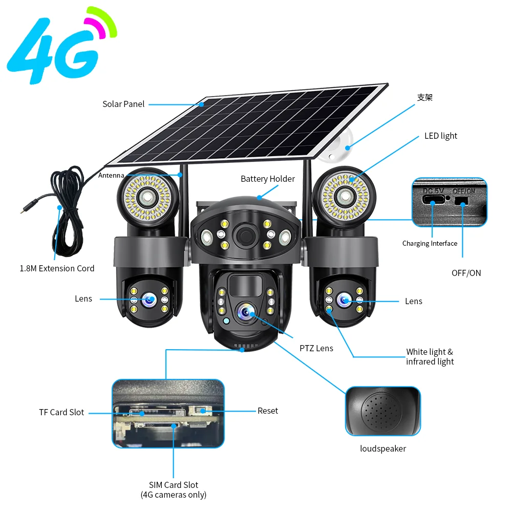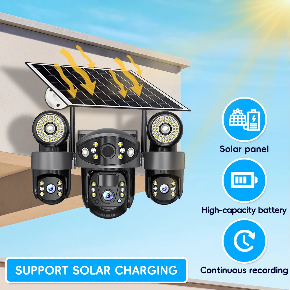 V380 Solar Camera 4G Sim Card Outdoor 3 Lens 3 Screen 10X Zoom PTZ Cameras Street Light HD Night Vision CCTV Security Protection