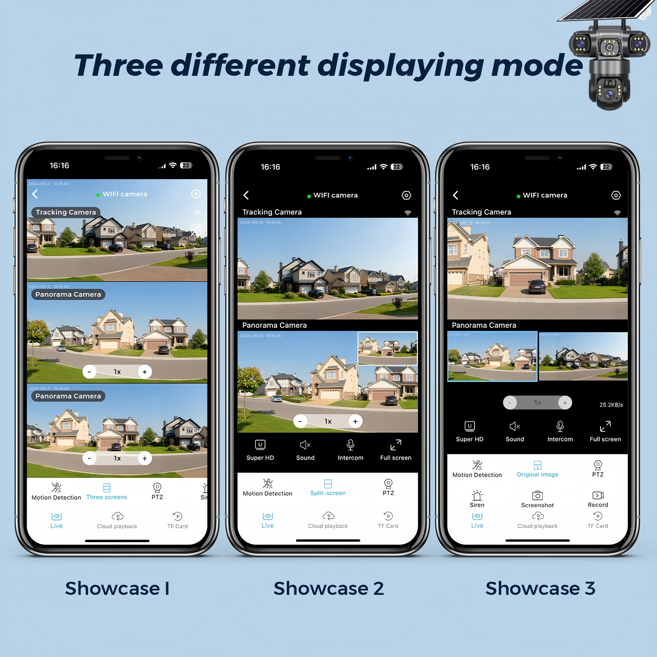 • 15MP three lenses three screens WiFi solar powered battery PTZ camera