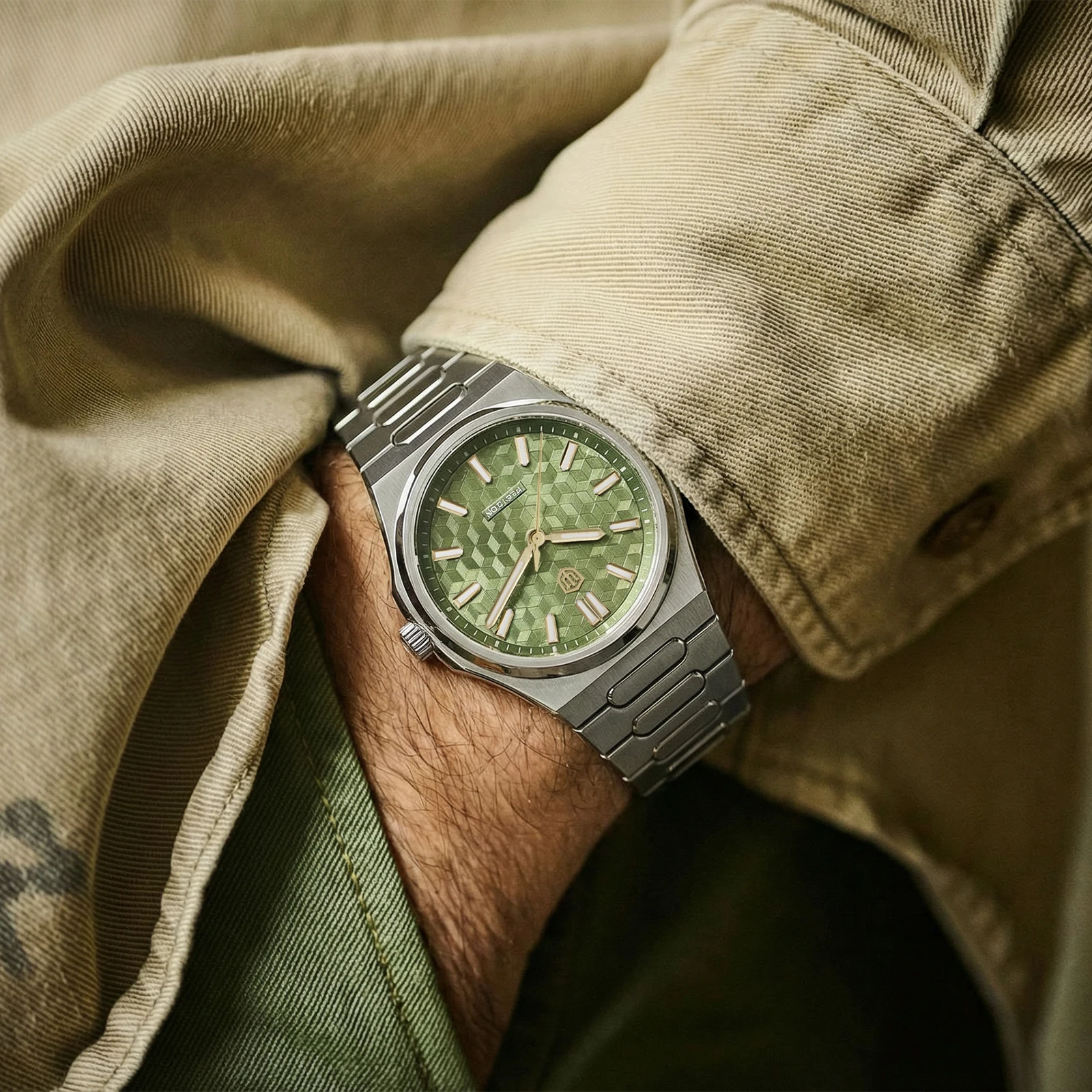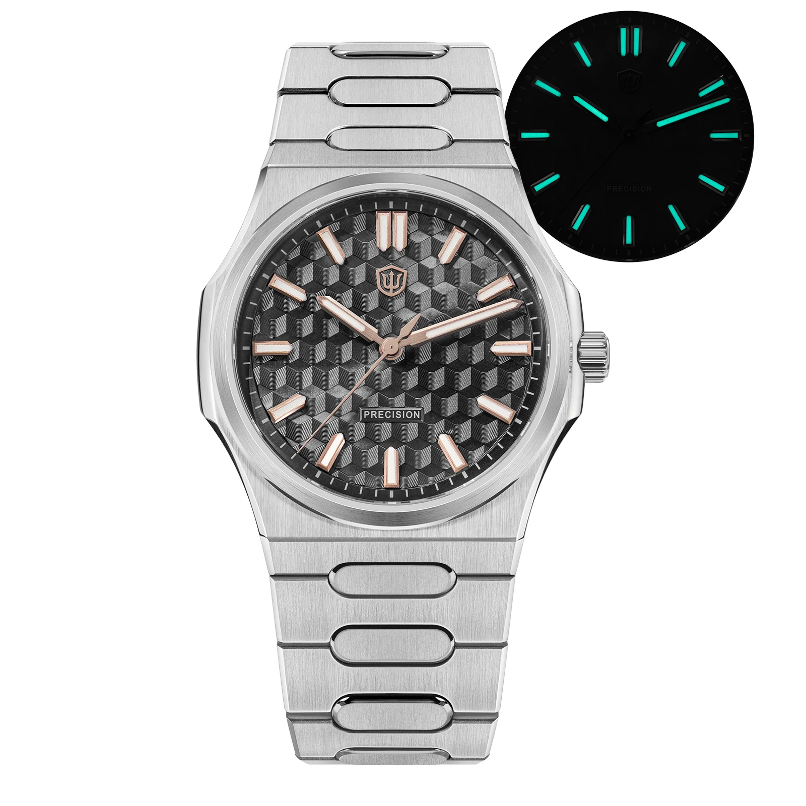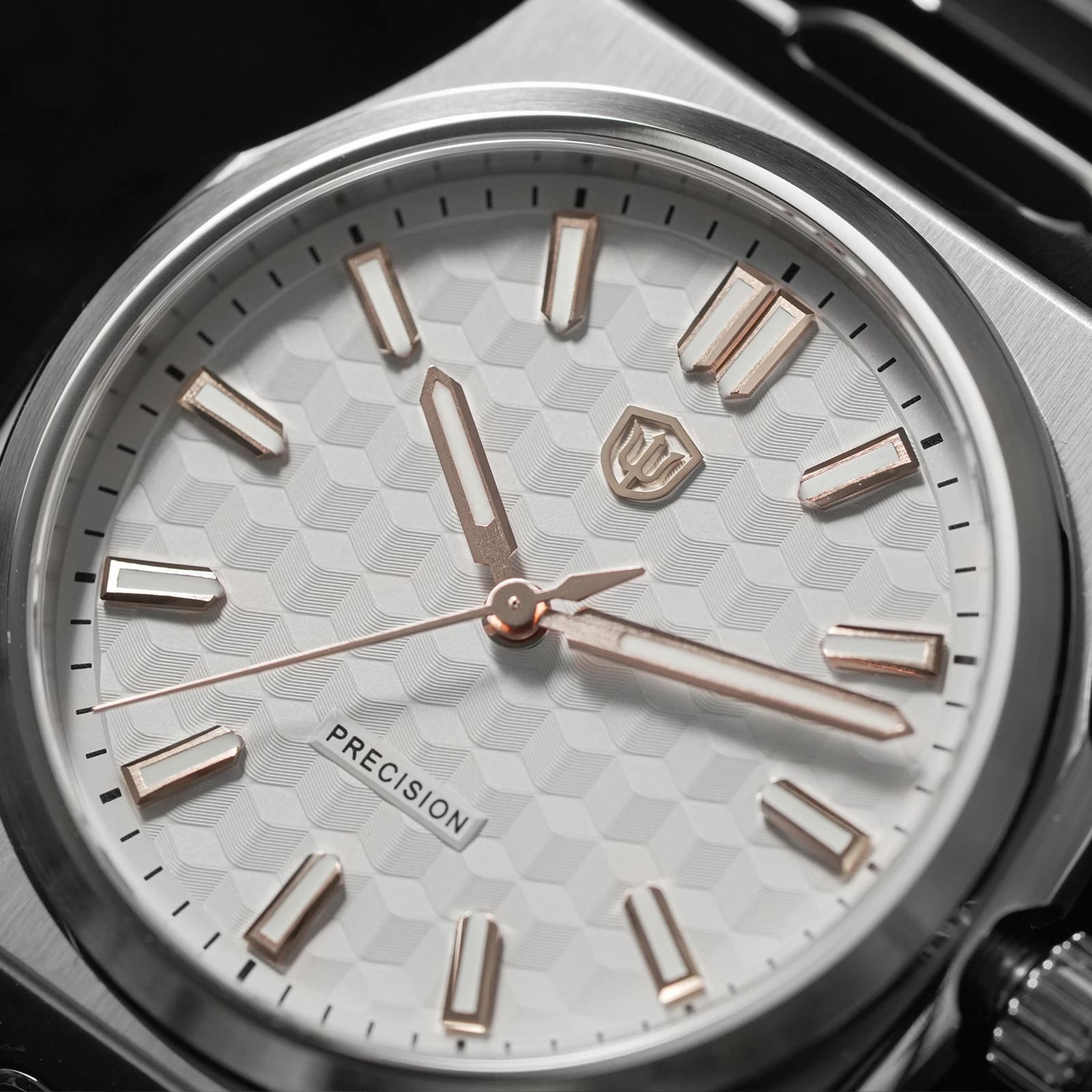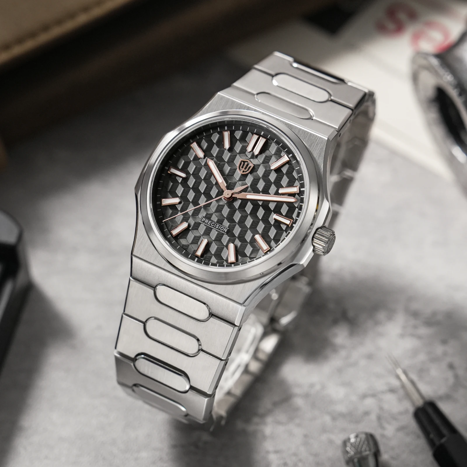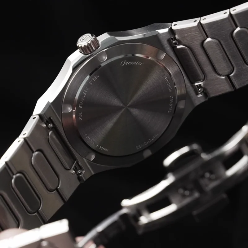 316L stainless steel case with multi-stage machining and hand-refined finishing. Clean geometry with softened edges and tight tolerances ensures precise visual alignment and a refined feel.