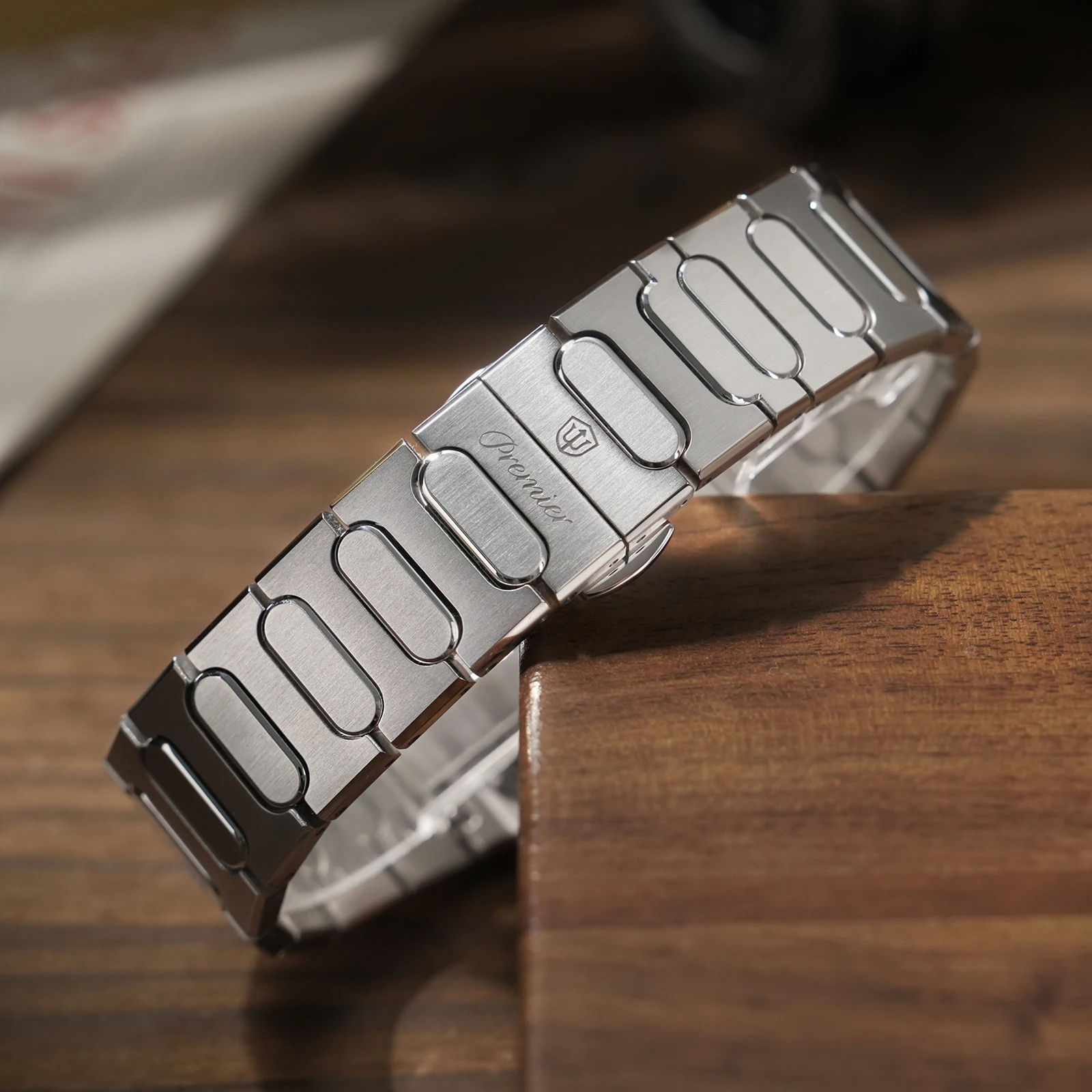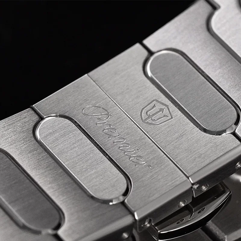 Solid stainless steel bracelet with screw-pin construction, uniform fine brushing, and smooth articulation. Quick-release spring bars allow easy strap changes; a customized strap will be developed specifically for this model.