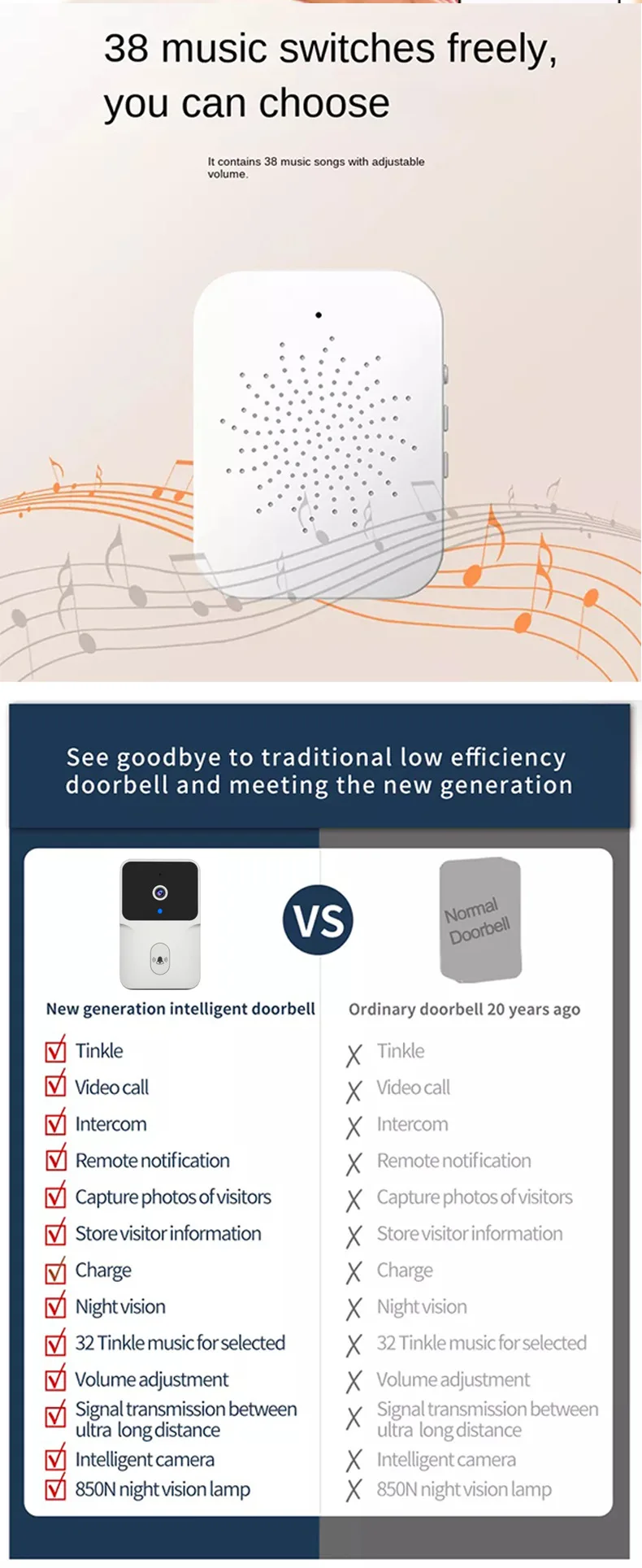 Long Standby: No disassembly cycle charging. Built-in lithium-ion high-capacity battery, long standby. The doorbell is powered by built-in large battery, no need to charge frequently; and the chime is of USB power supply, easy and convenient for use.