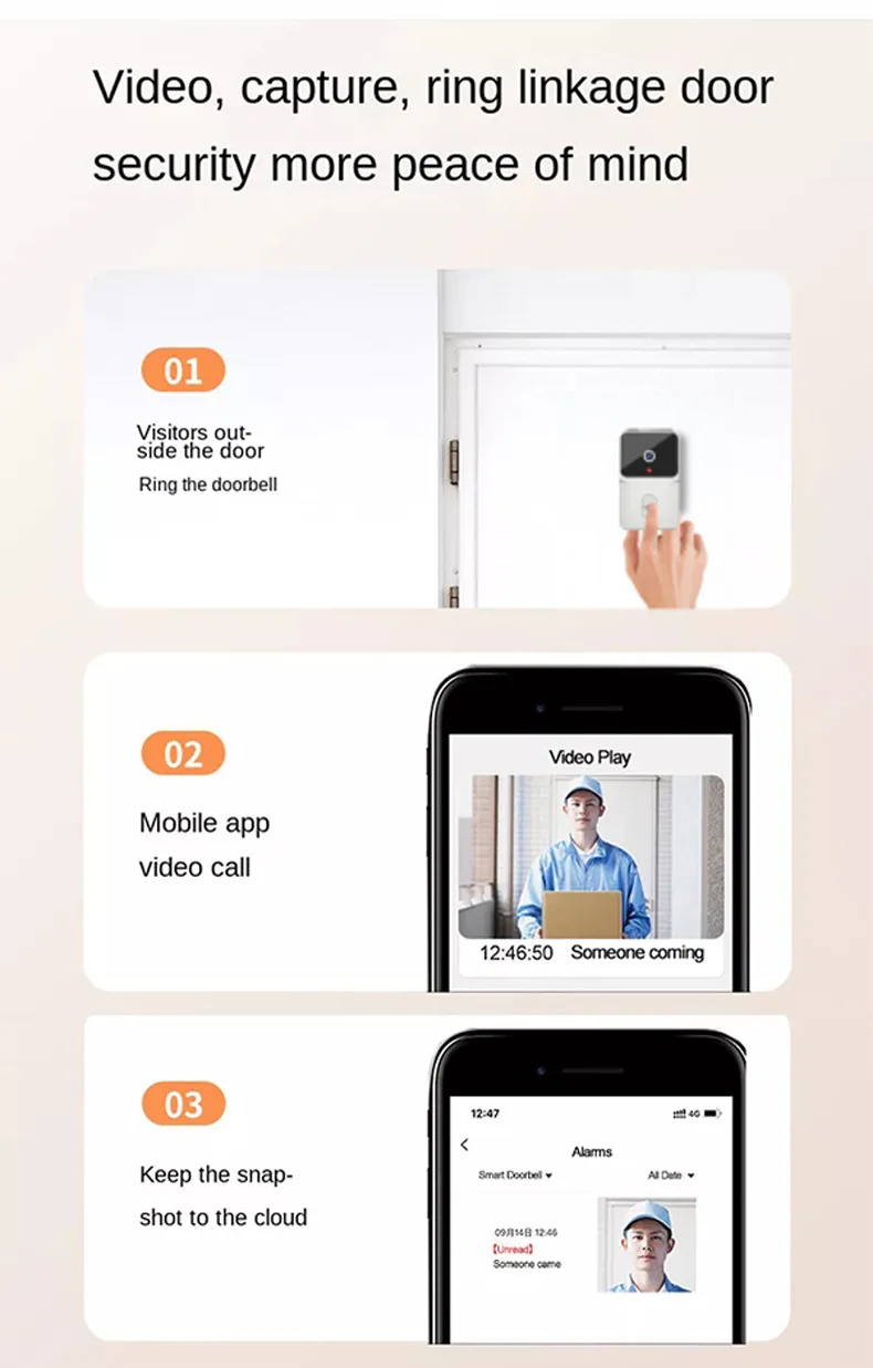 Capture Screen: Storage to the cloud, security protection drip. When a visitor presses the doorbell, it can capture the visitor's picture and save the record to the cloud, so that the cell phone APP can view the past pictures at any time, which is safer and more secure.
