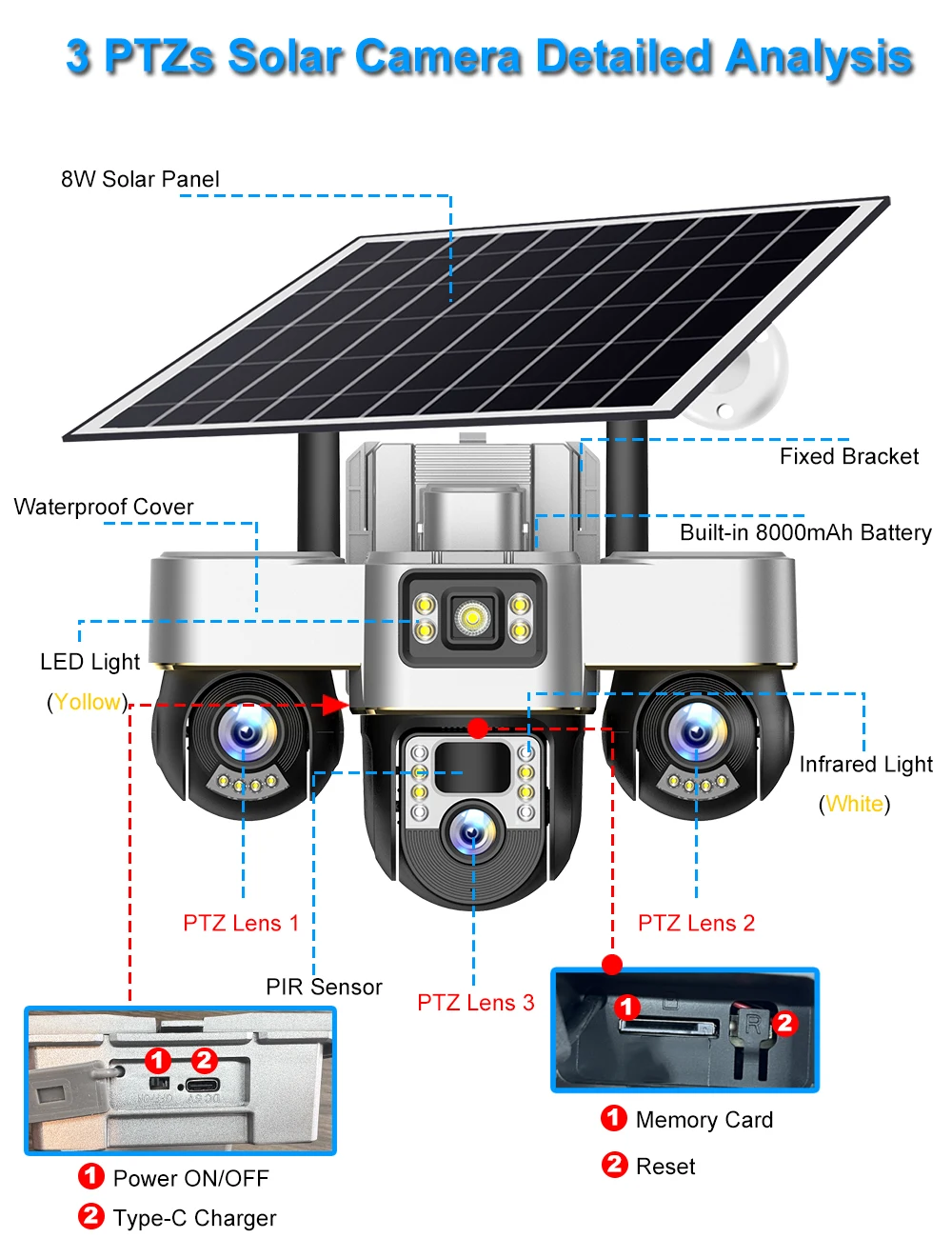 – Built-in 8000mAh battery and match 8W solar panel continue to charge;