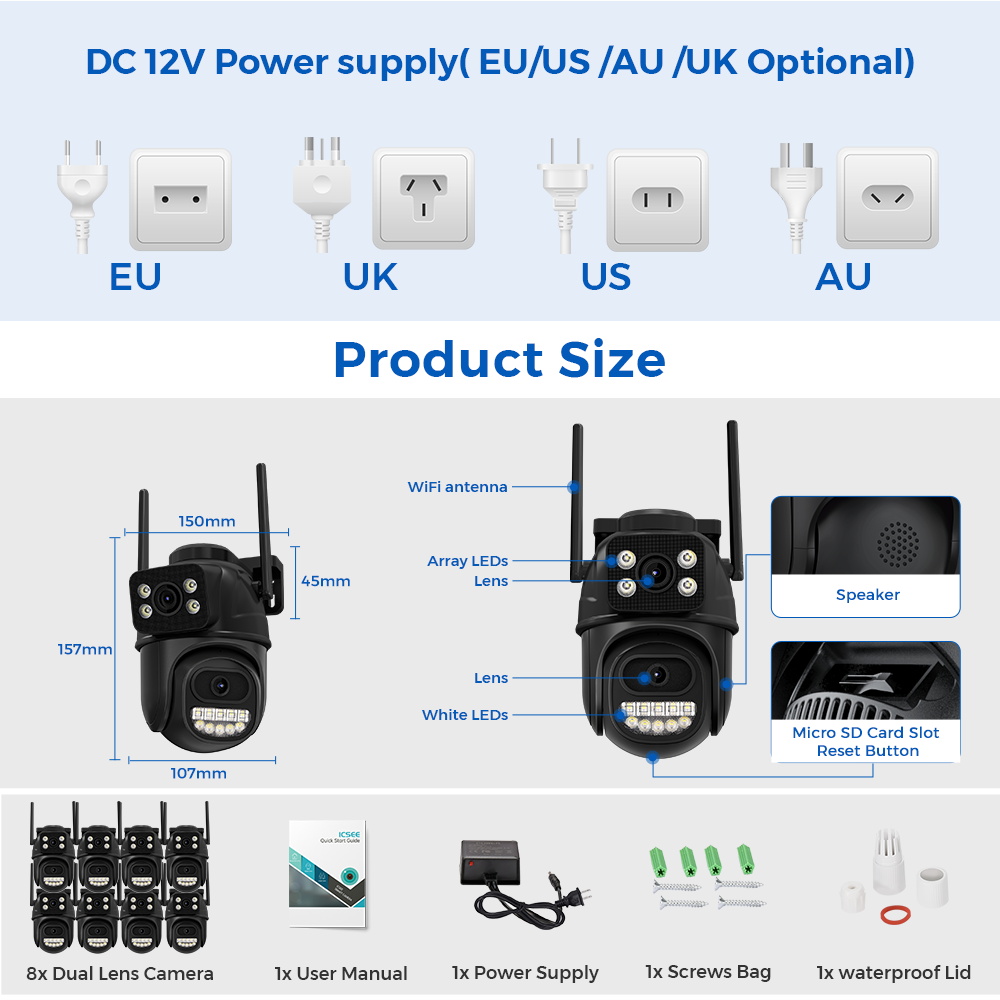 2PCS Cameras: include 2pcs Dual Lens Camera+Plugs+Instruction Manual+Other products.