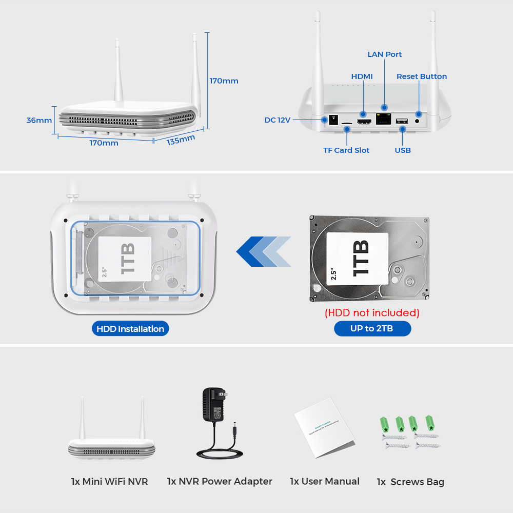 Products in the WIFI set need to be purchased separately, you have the flexibility to match NVRs with hard drives and cameras to your individual needs.