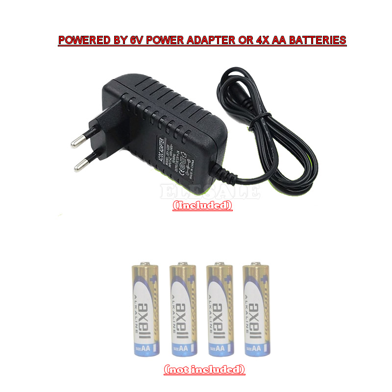The motion detector power by 4 AA batteries (not included) or 6V power adapter (included)
