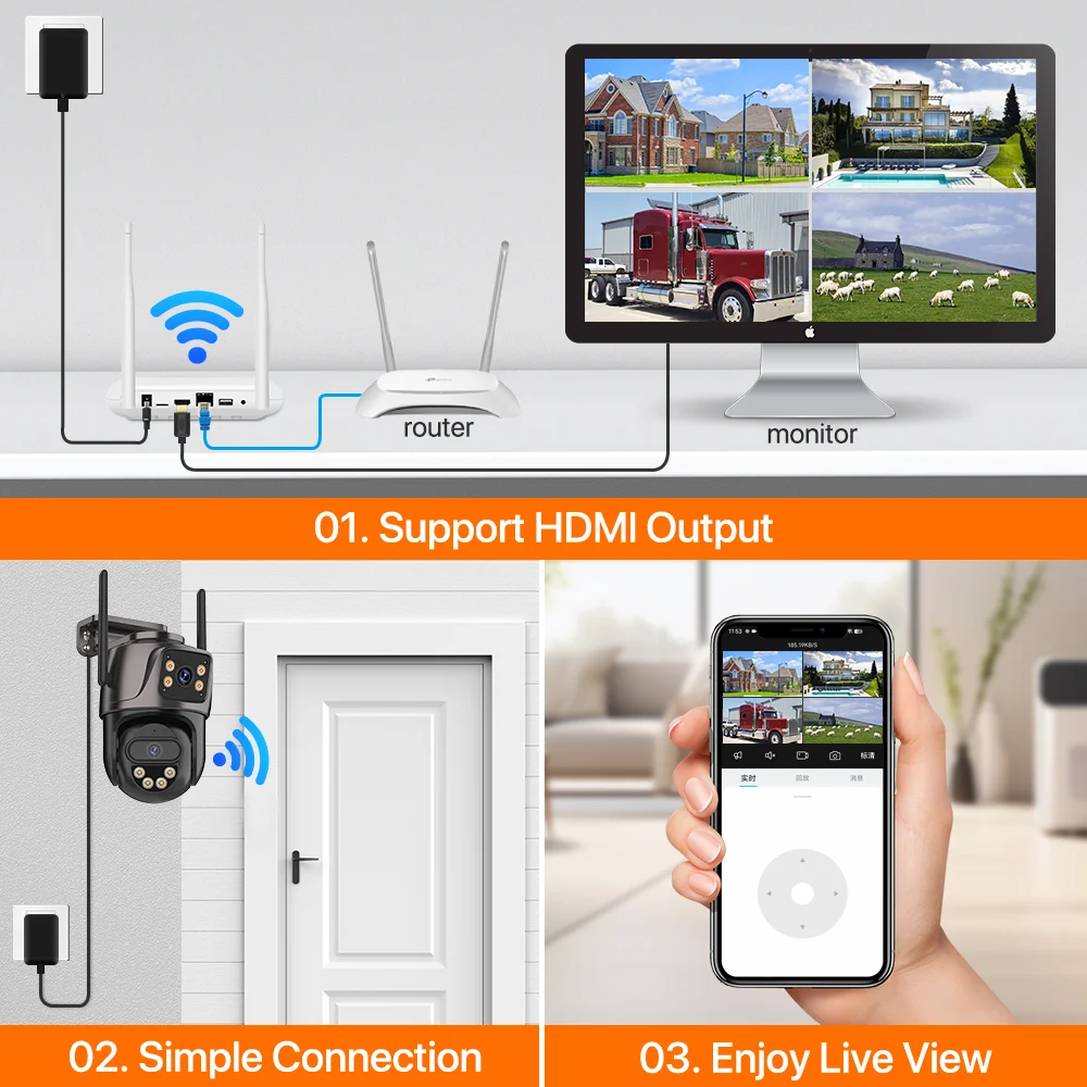 Just connect the camera and the NVR to the power supply, and connect the NVR to the router to use, which is very convenient(Need to be used with our customized camera)
