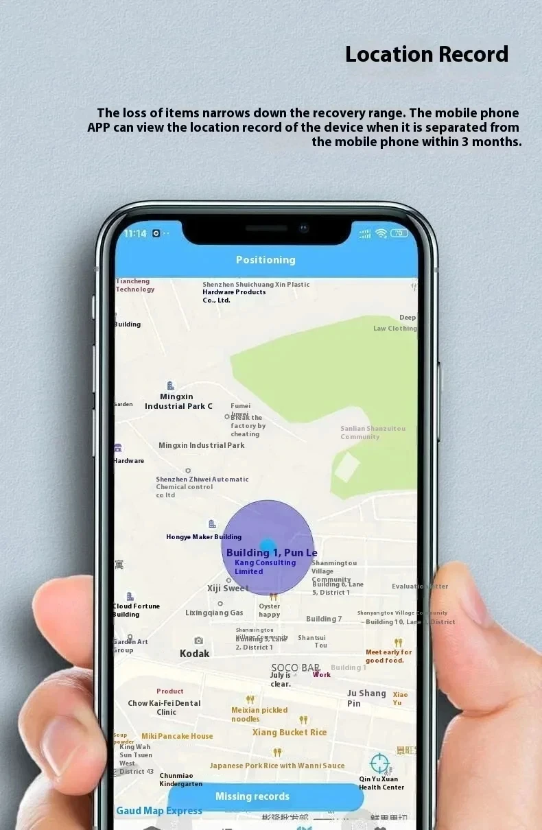 ►【Location Record Locator】App has a real-time location map and will record the last connected location to help you find it back. so you can open the map in the App to speculate the approximate location of your missing items.