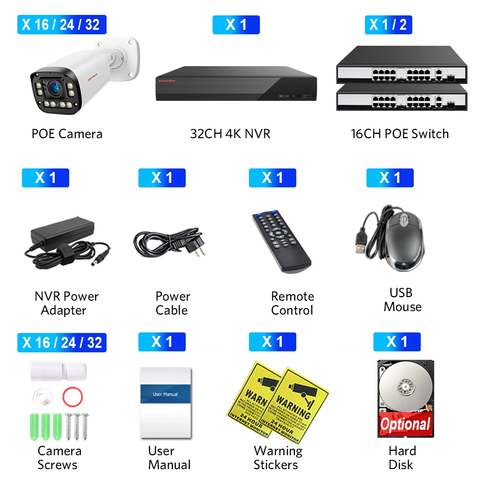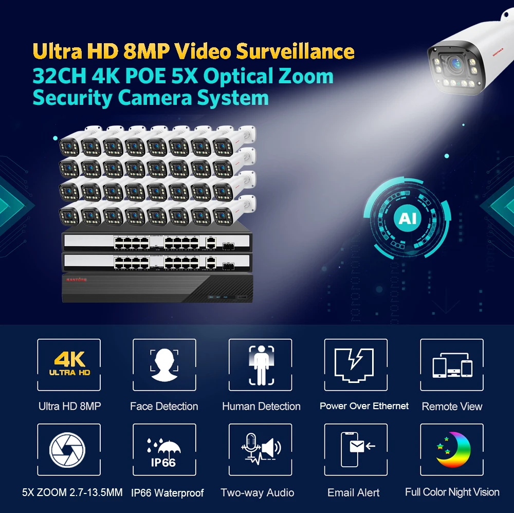 XMEYE 32CH 4K Camera Kit 5X Optcial Auto Zoom 8MP Ai Face Detect Two Way Audio Waterproof Video Security System P2P Onvif NVR