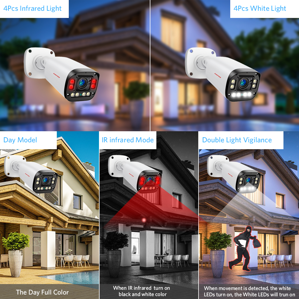 Three lighting modes, in addition to normal daylight mode and night vision mode, when an alarm occurs at night, the camera will automatically turn on the white light to increase the exposure, providing you with color images without losing any details