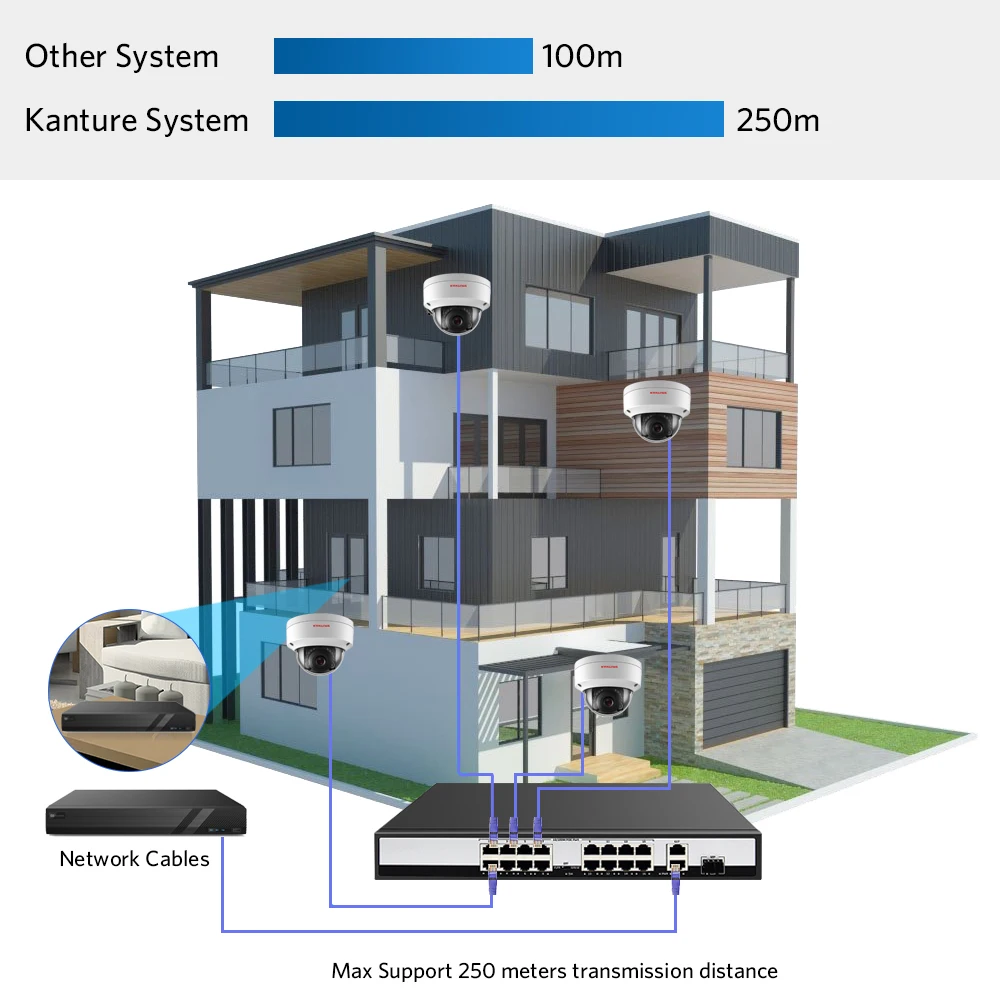 POE System max support 250m POE cables transmission distance which greatly increases home installation convenience.
