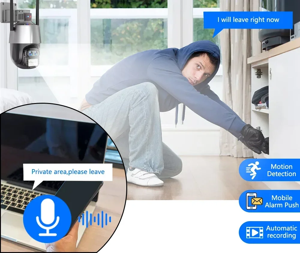When someone breaks into shooting area, the camera will make alarm sound and alarm message will be pushed to your Phone APP. And when it motion detect, 4 white LED lights will light up, showing you the color night scene.