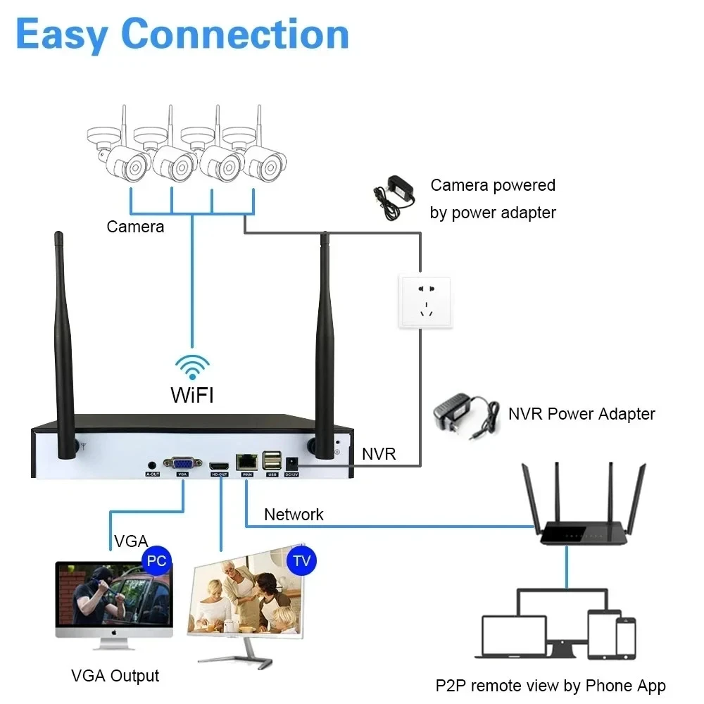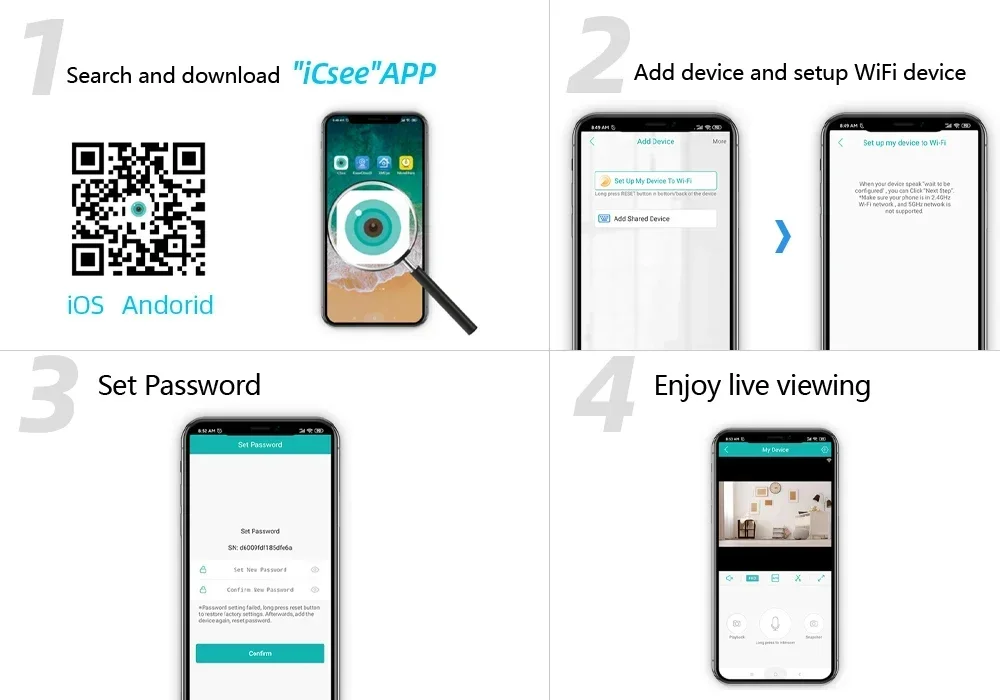Easy setting , just 4 steps for mobile phone viewing,View live video of the system from anywhere and anytime via you smart phone, table or PC with advanced P2P technology, you are able to remote access your system in minutes or less, no portforwarding needed, remote access has never been so easy!!! App is ICSEE or XMEYE pro.